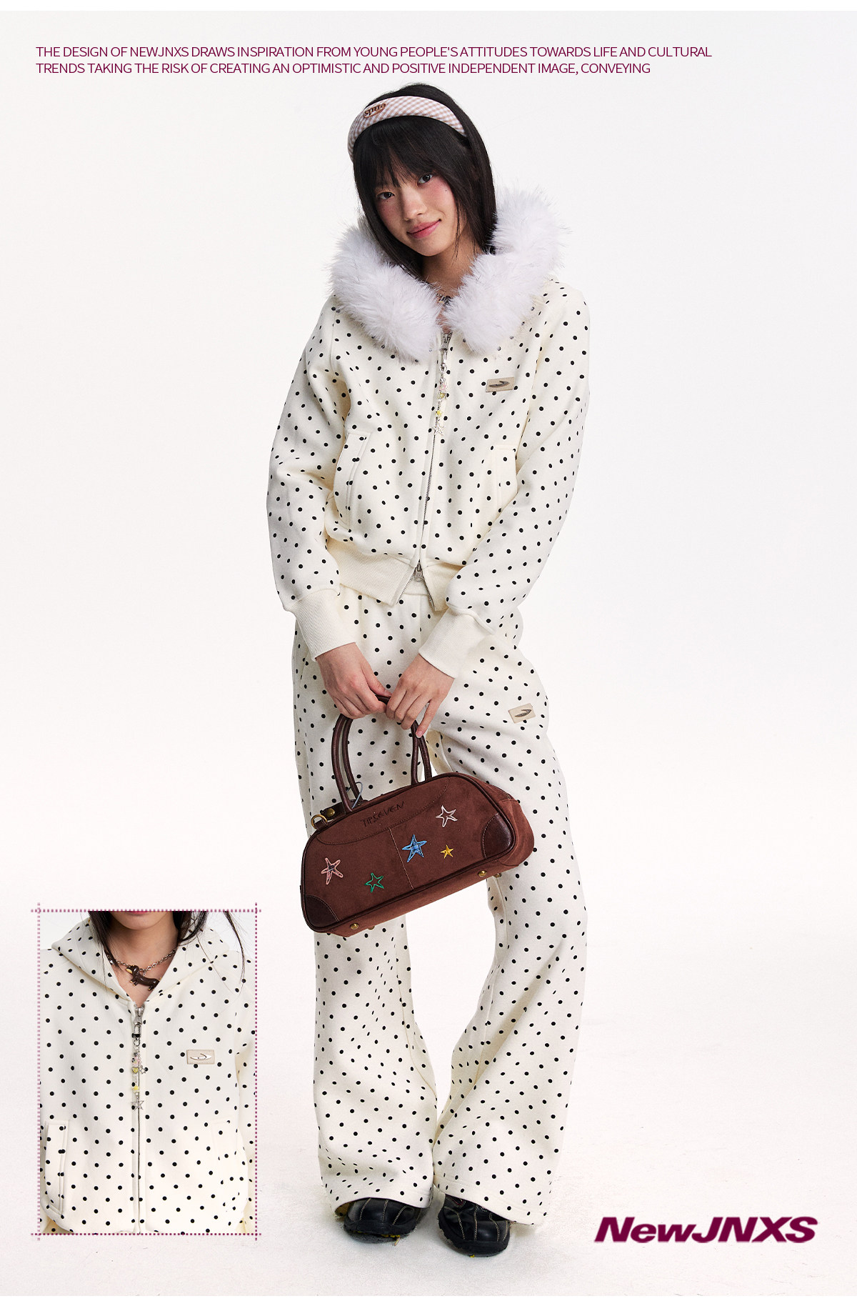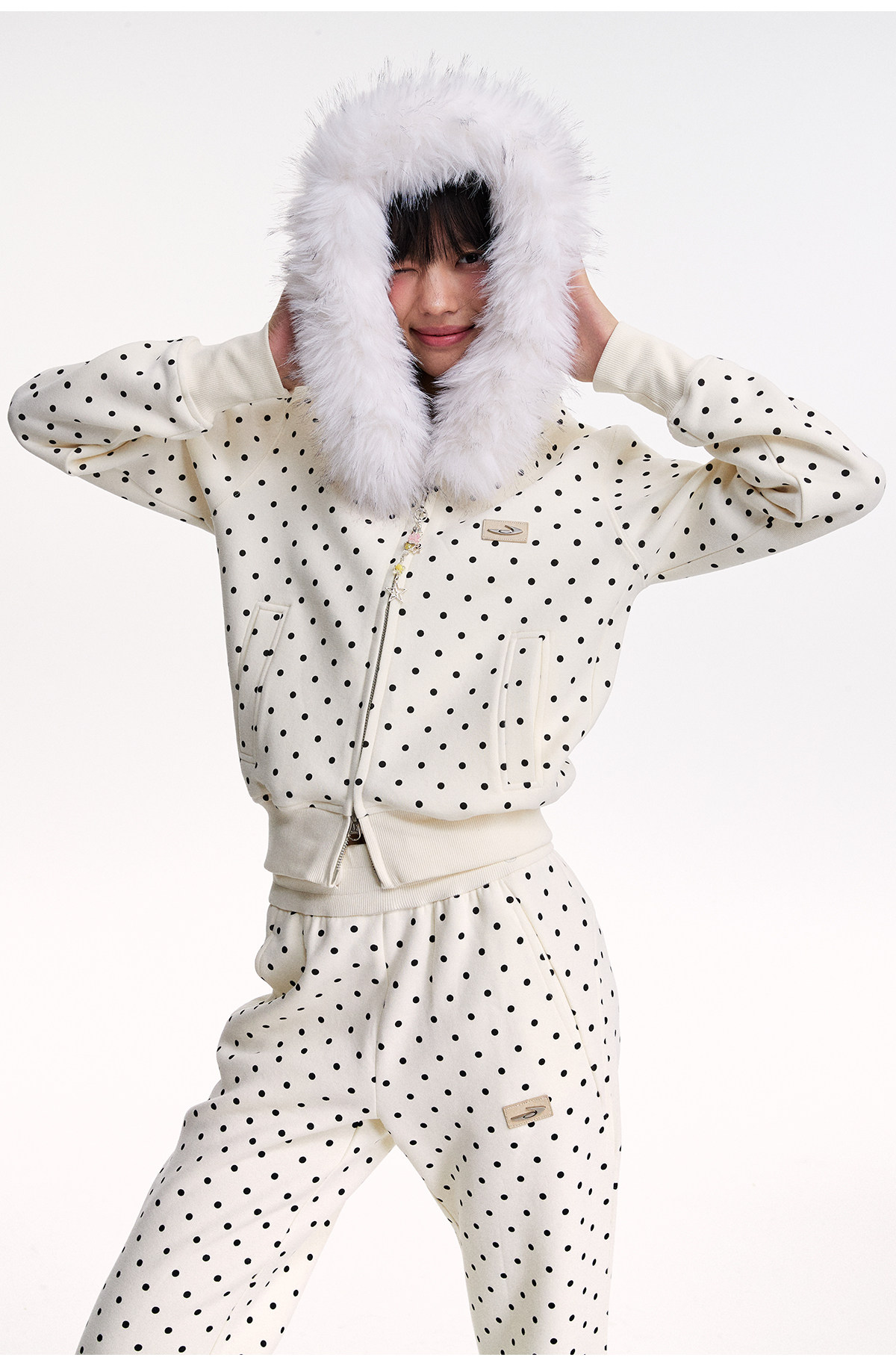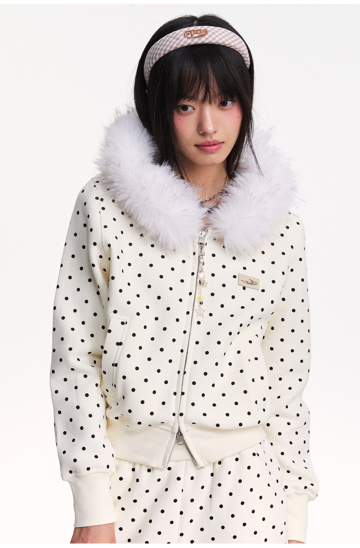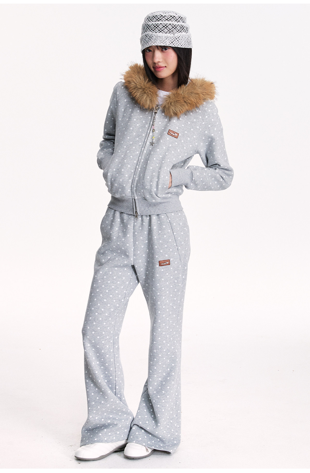 Mr. Jiangnan NewJNXS Polka Dot Detachable Fur Collar Cropped Cardigan Sweatshirt Set