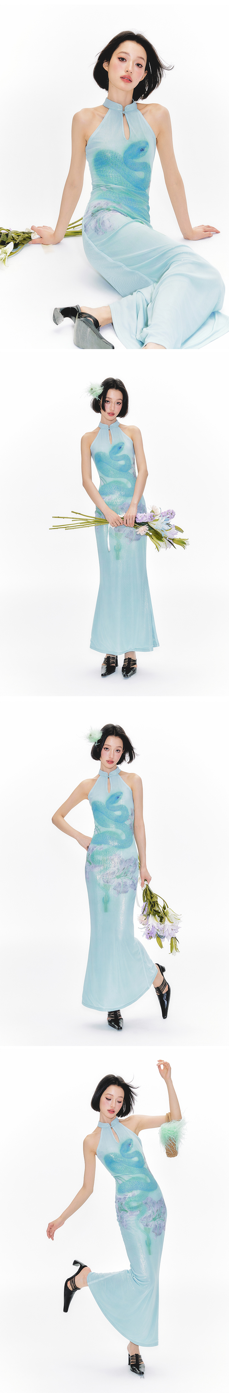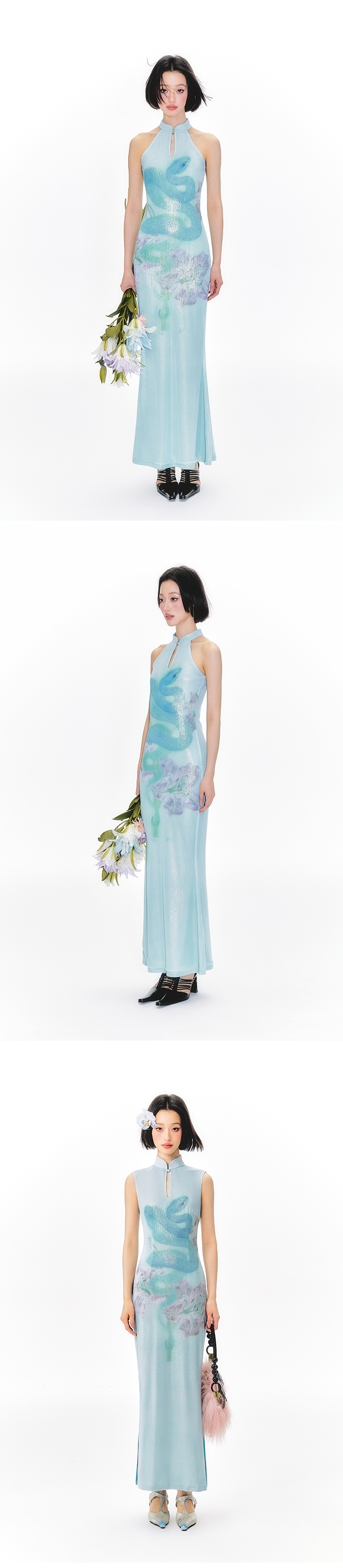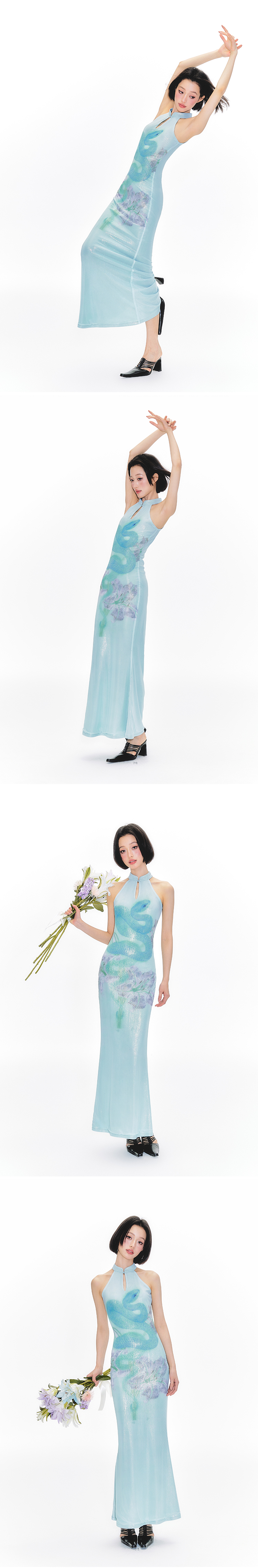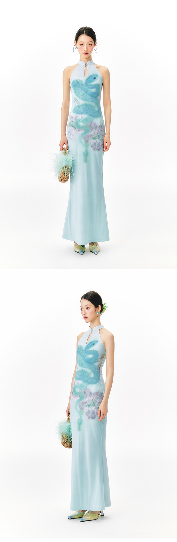 YEDM Blue Snake Print Neck Cheongsam Dress