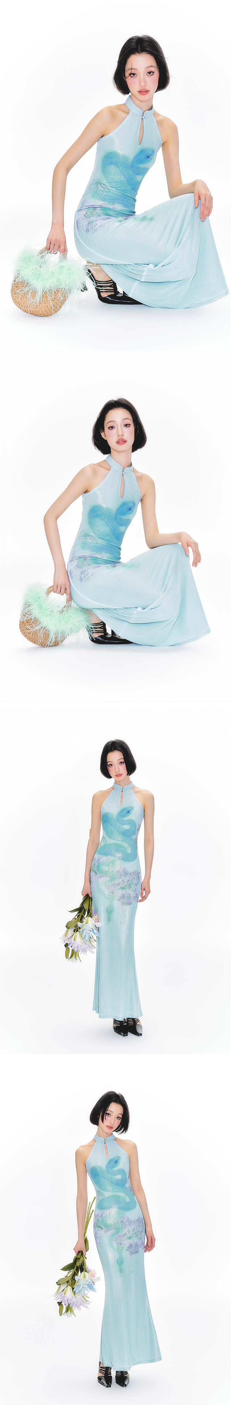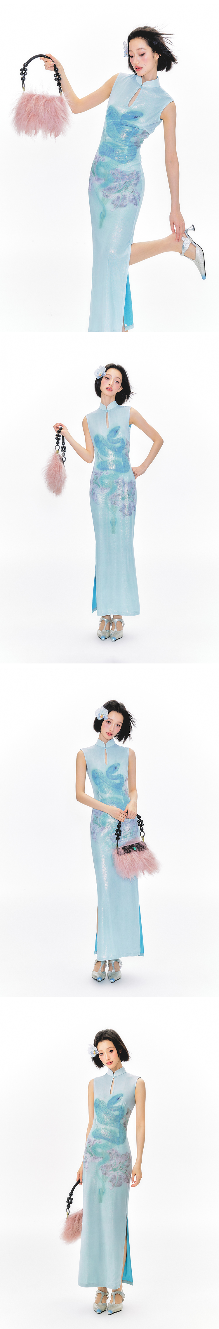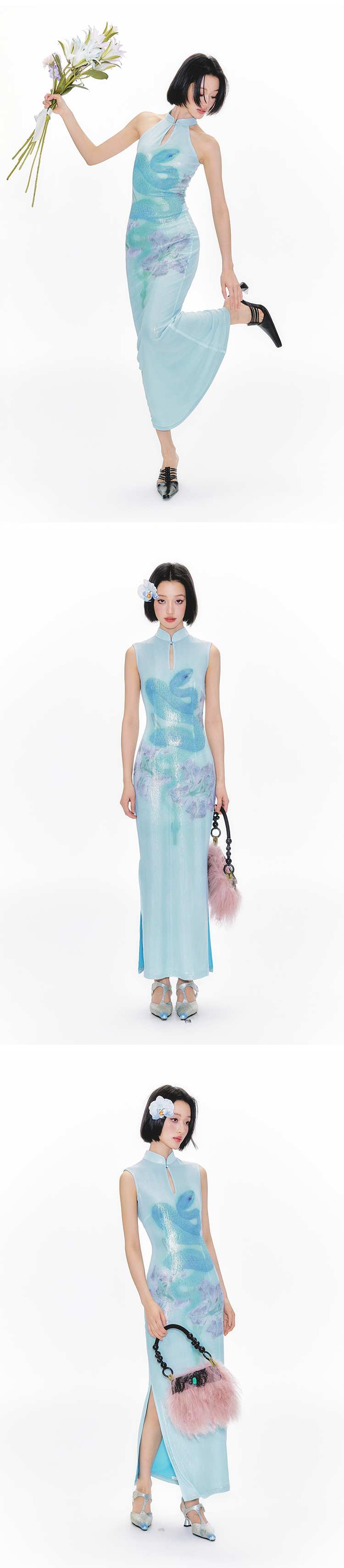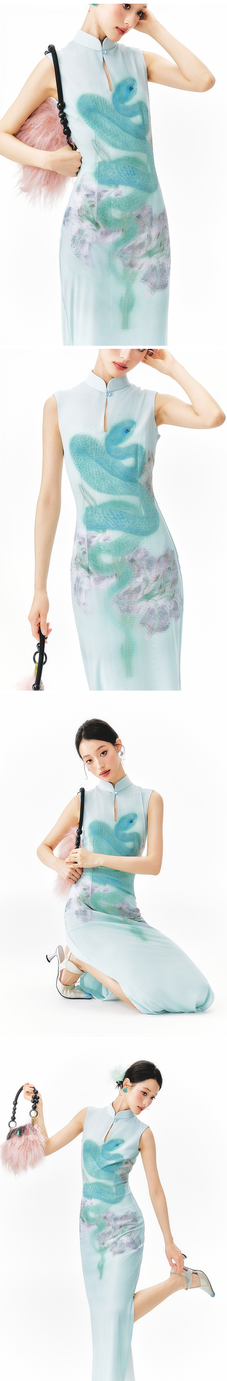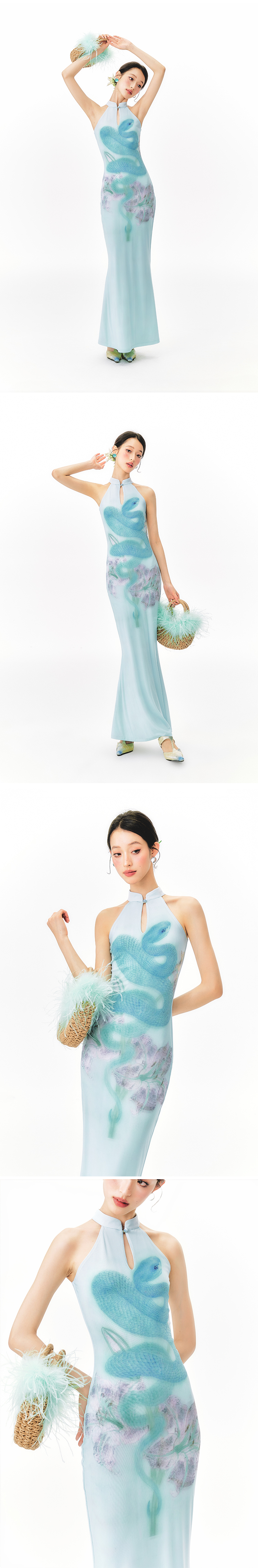 YEDM Blue Snake Print Neck Cheongsam Dress
