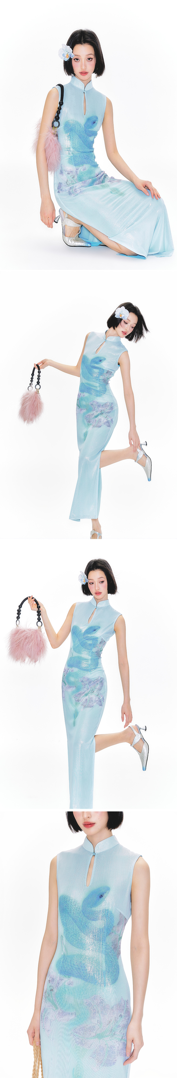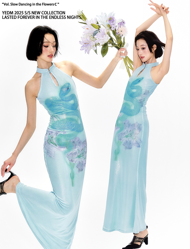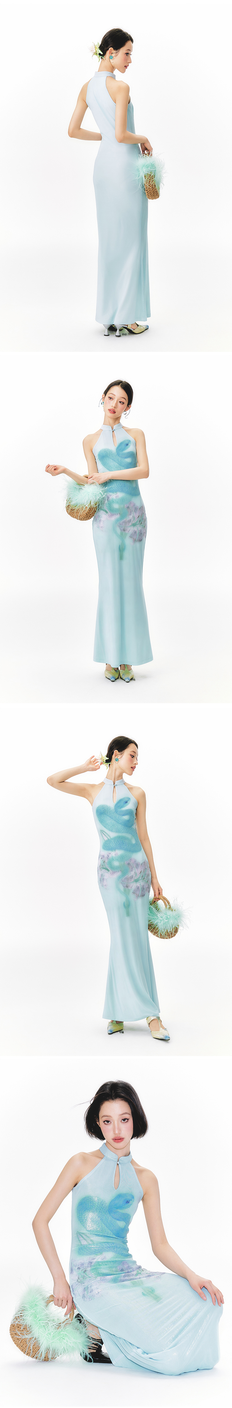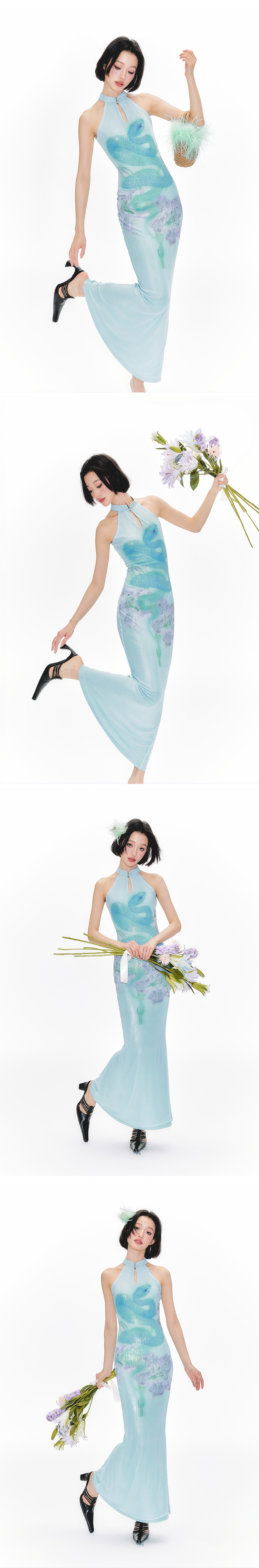 YEDM Blue Snake Print Neck Cheongsam Dress