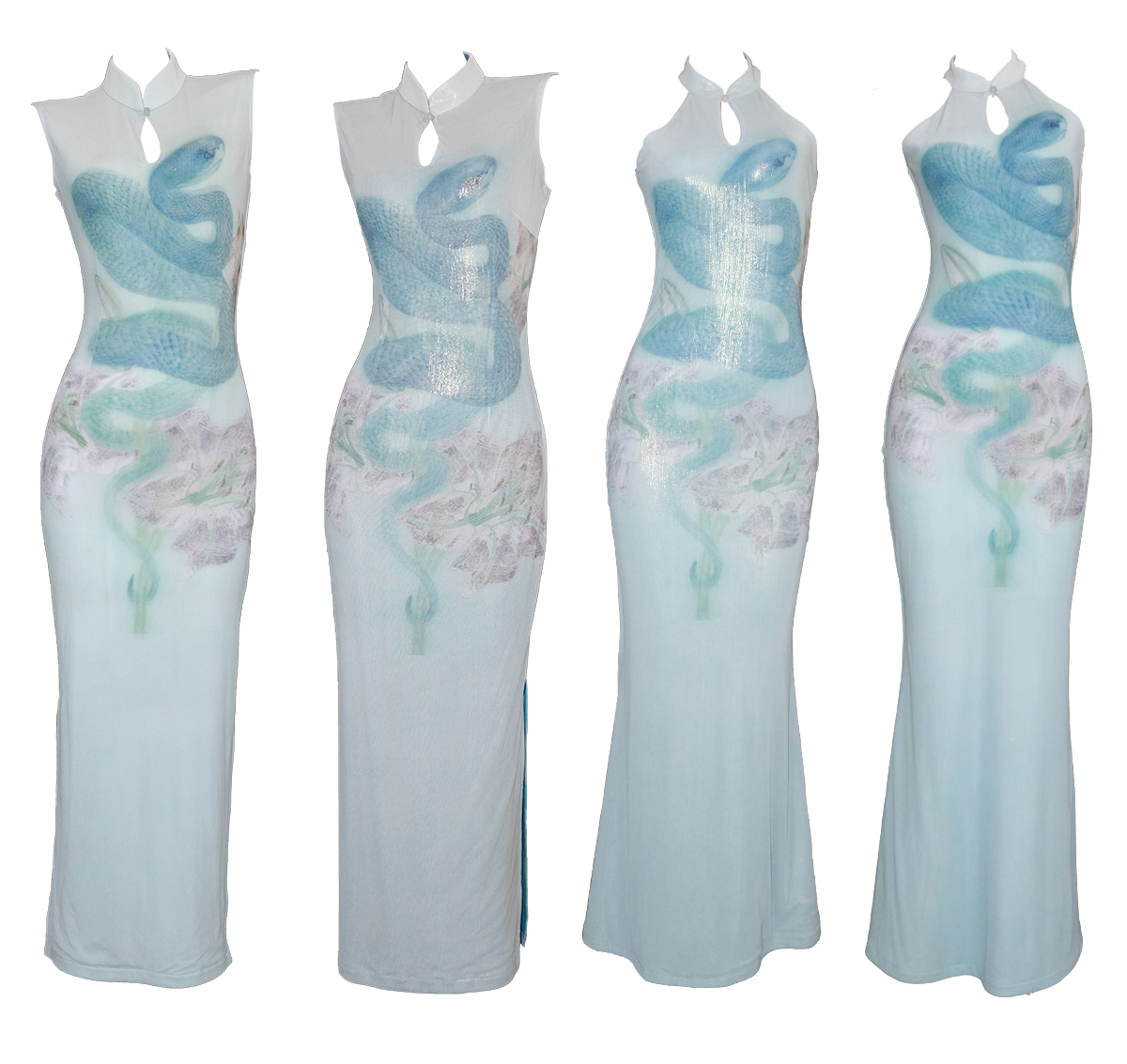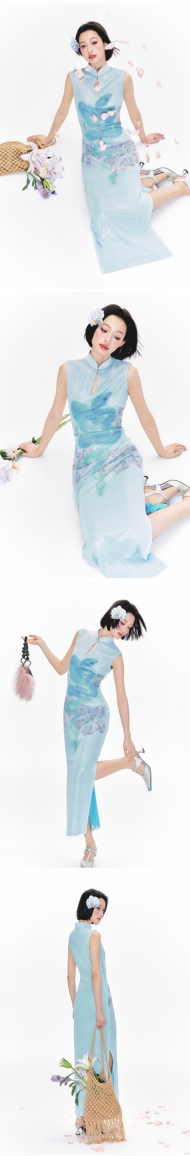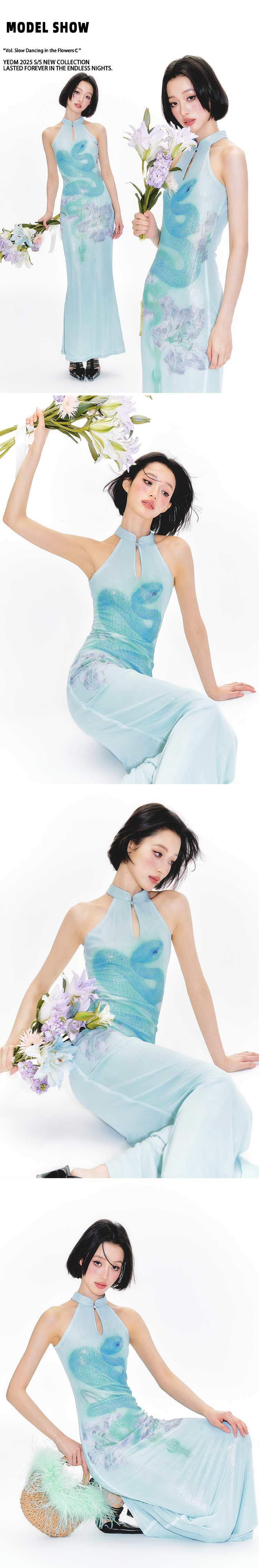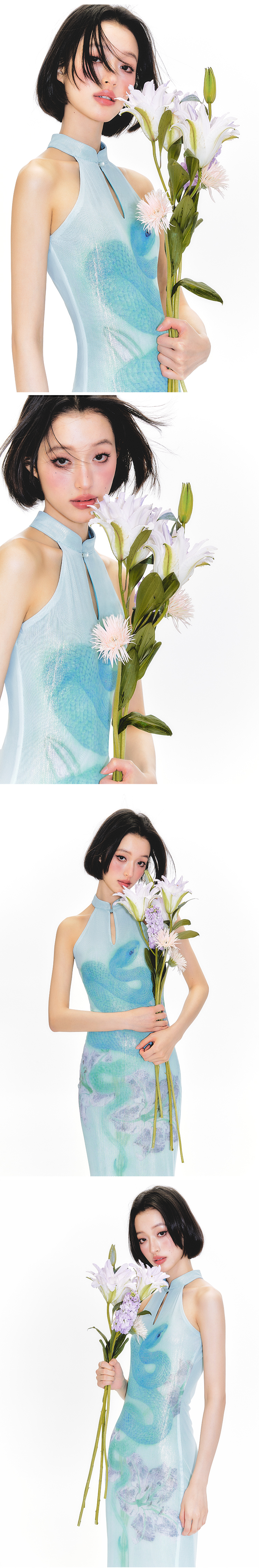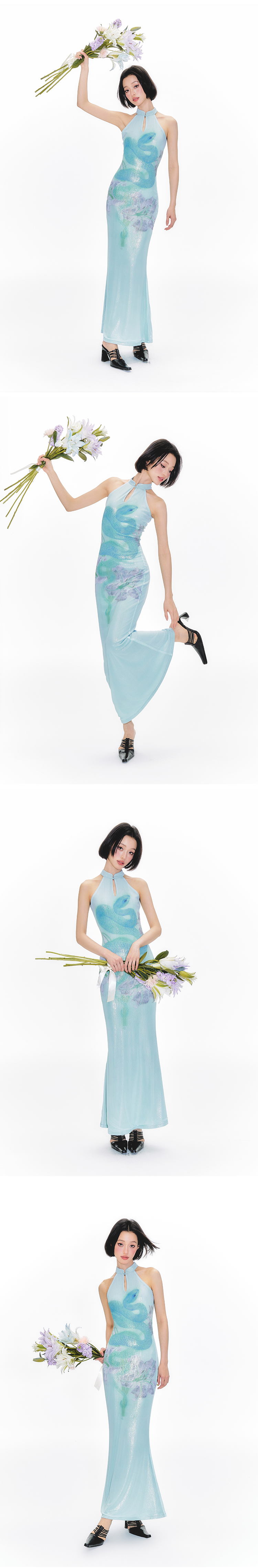 YEDM Blue Snake Print Neck Cheongsam Dress