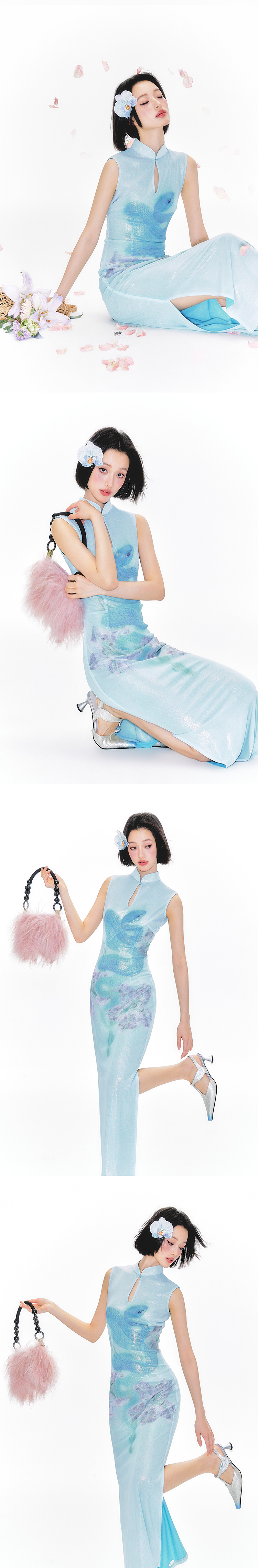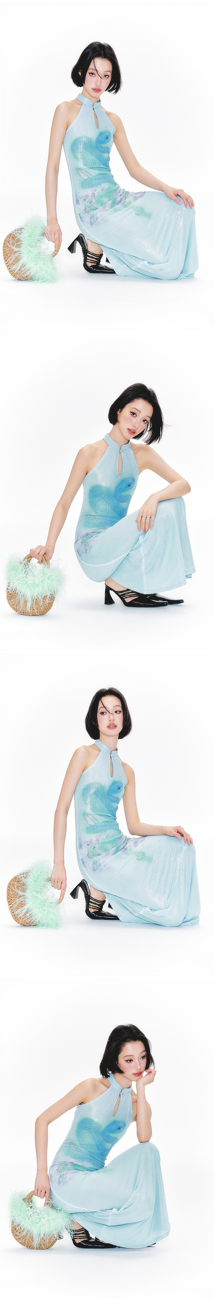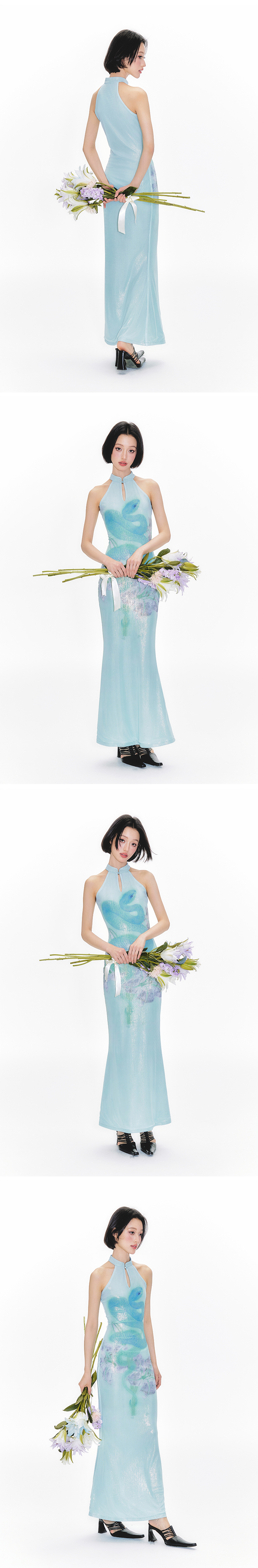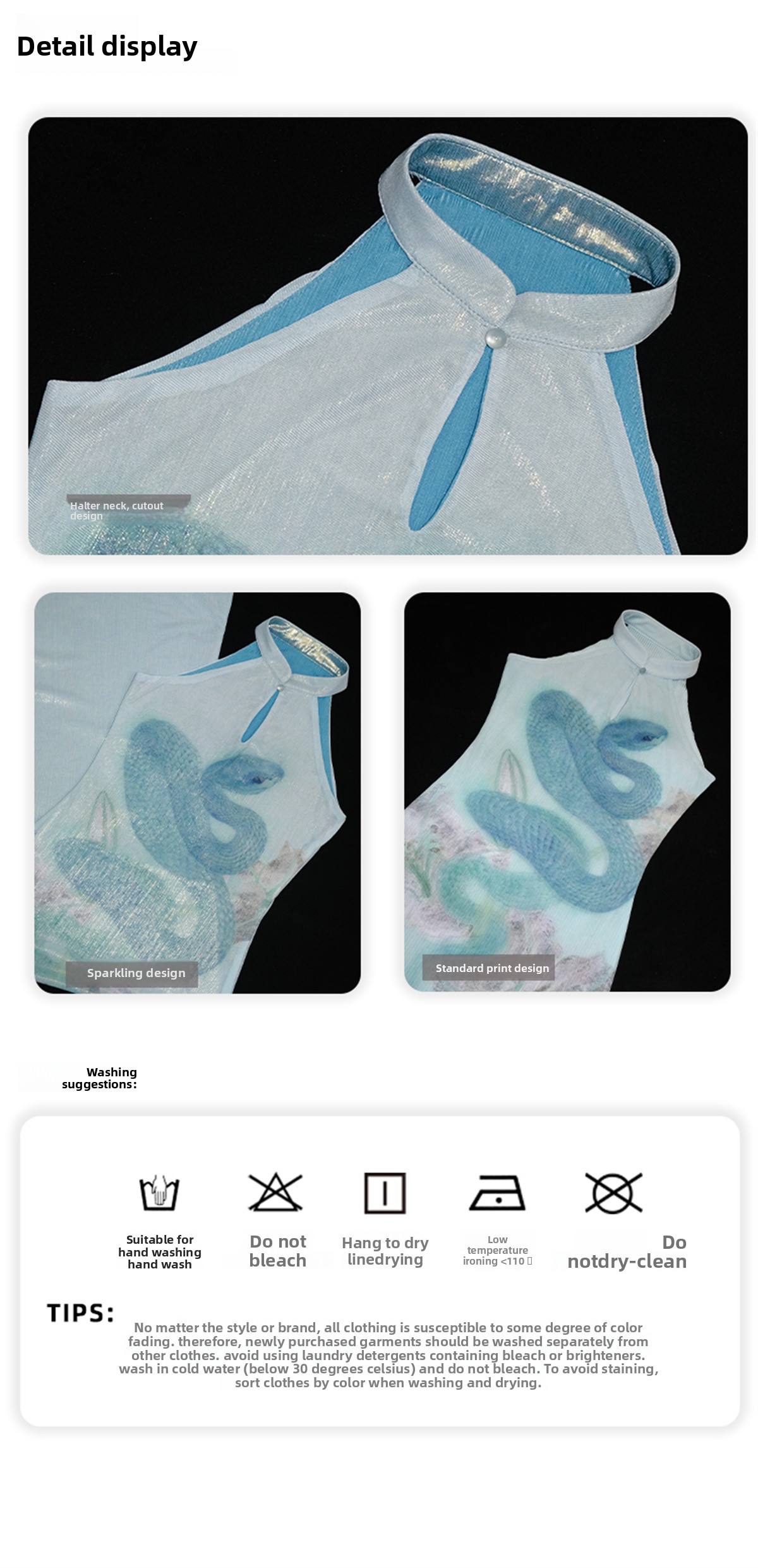 YEDM Blue Snake Print Neck Cheongsam Dress