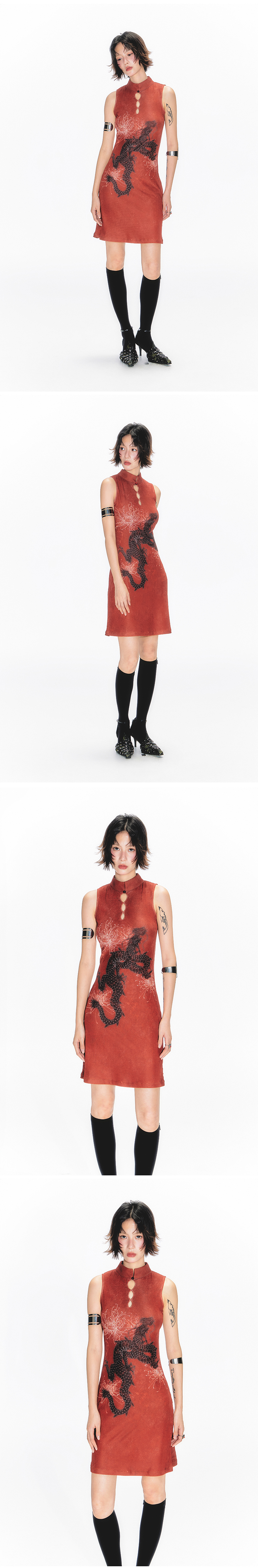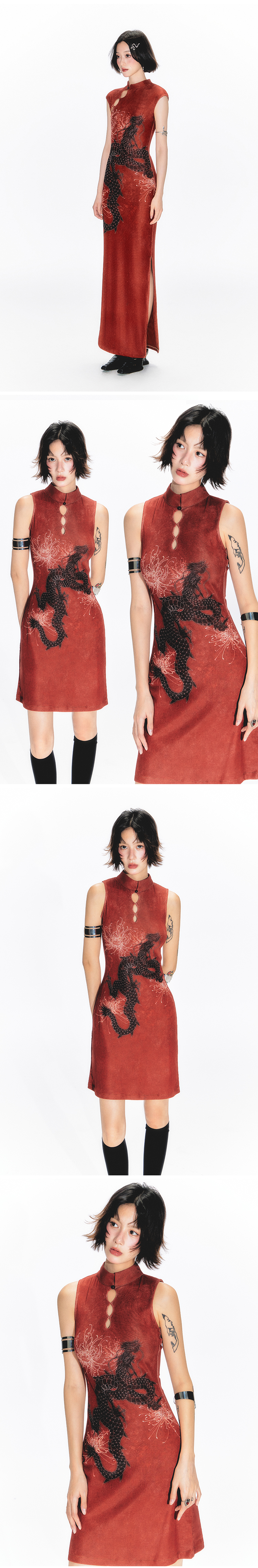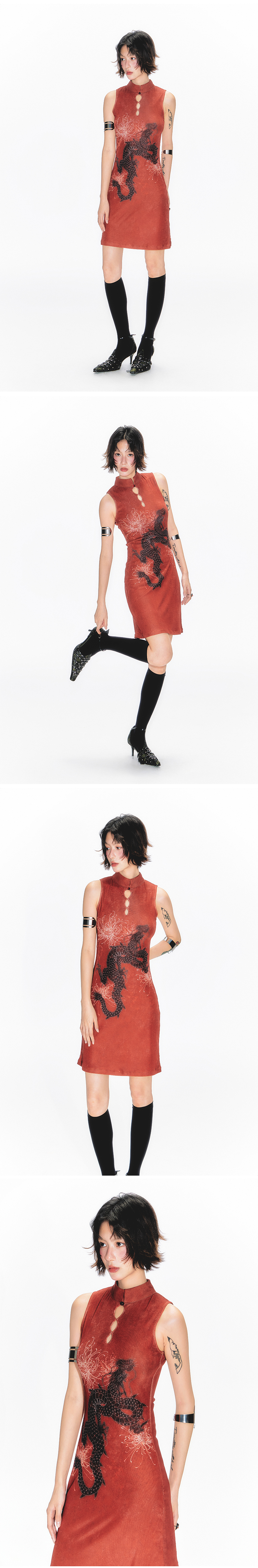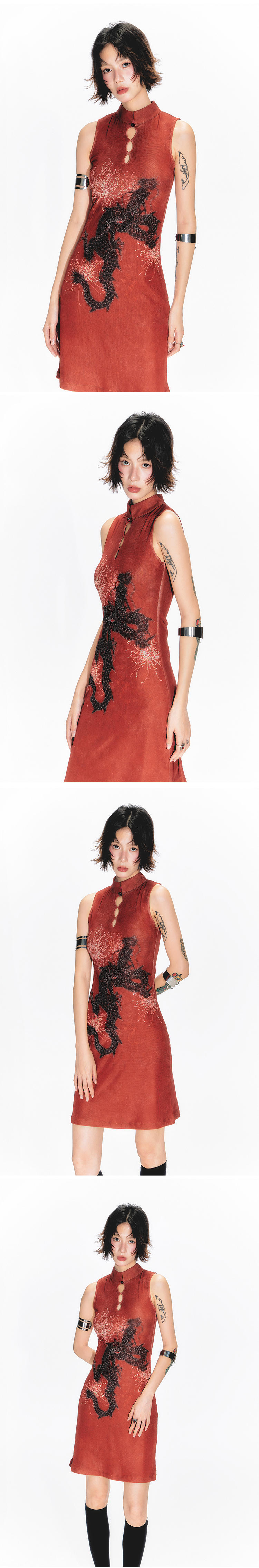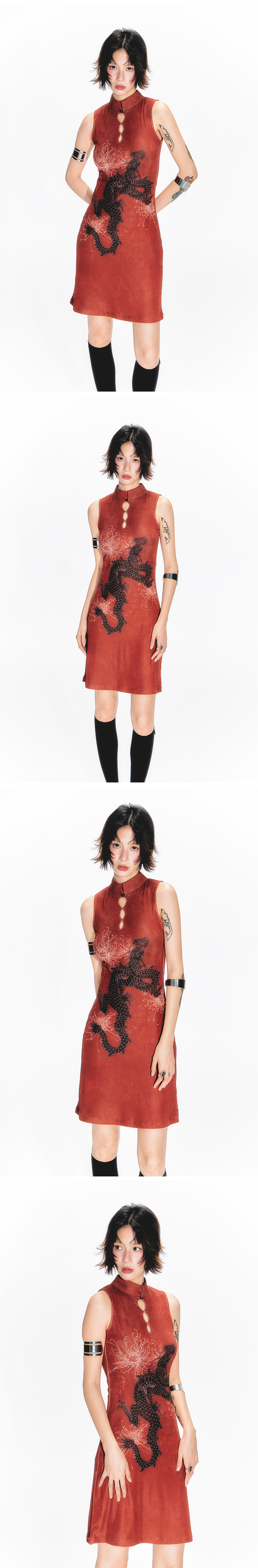YEDM Dragon Print Stand-up Collar Sleeveless Dress