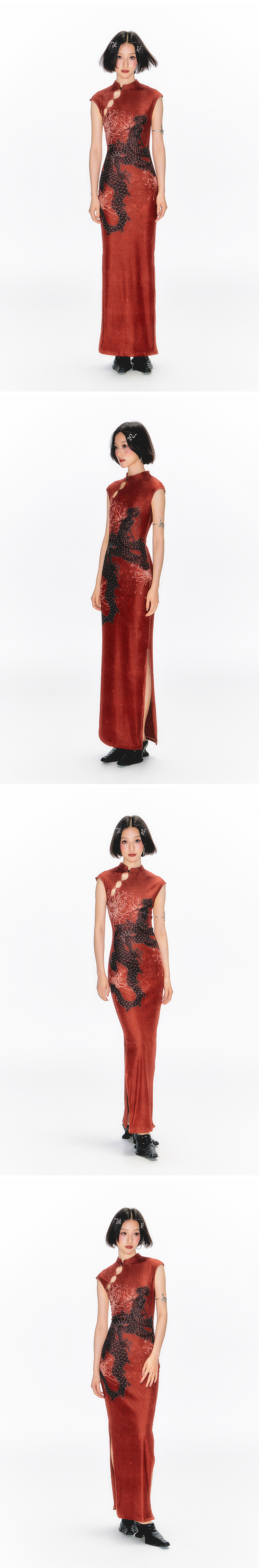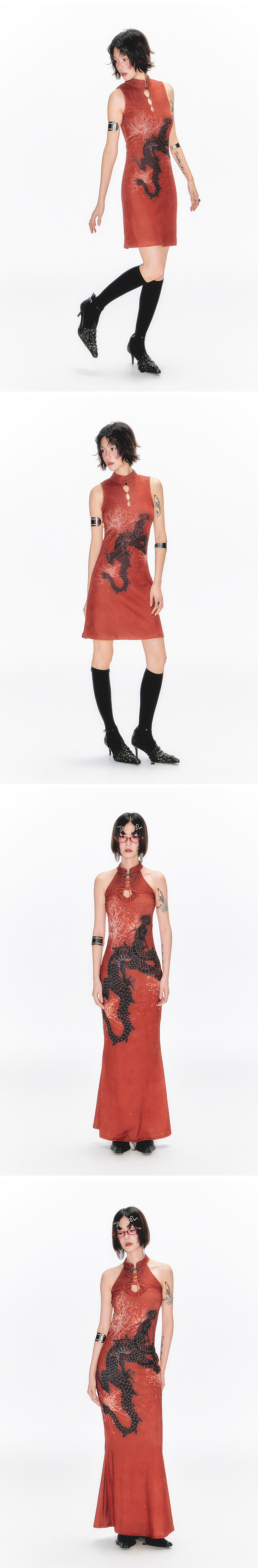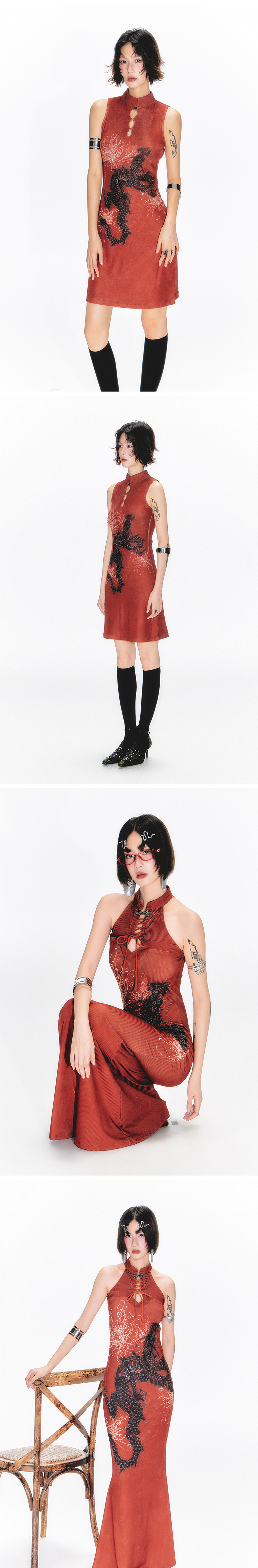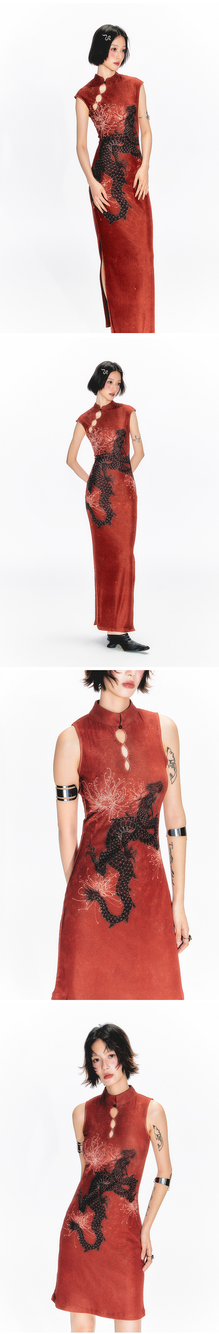 YEDM Dragon Print Stand-up Collar Sleeveless Dress