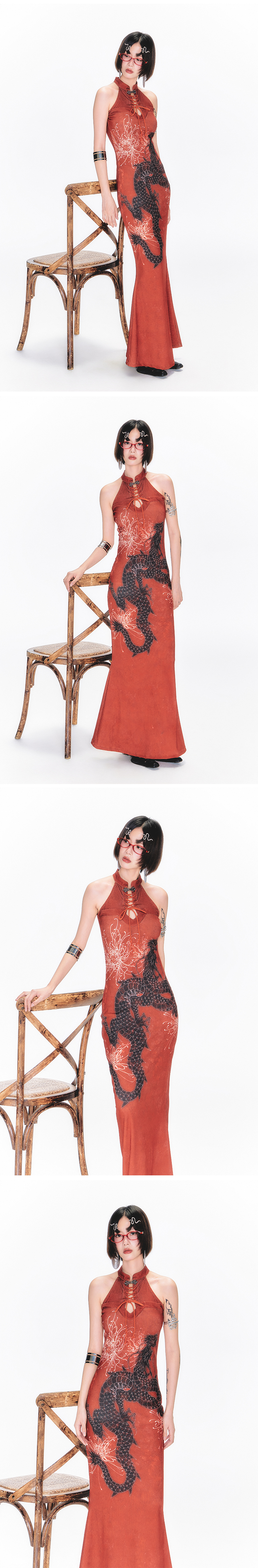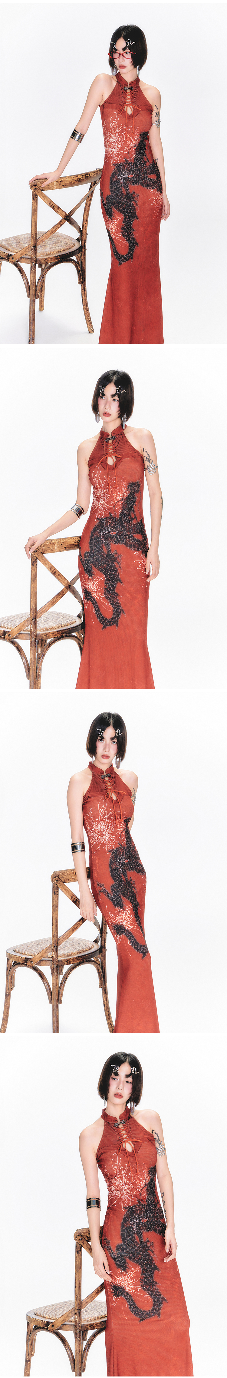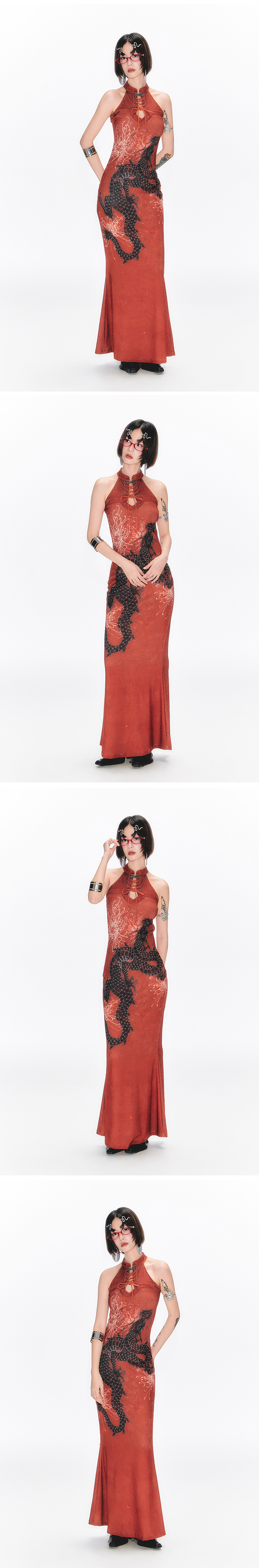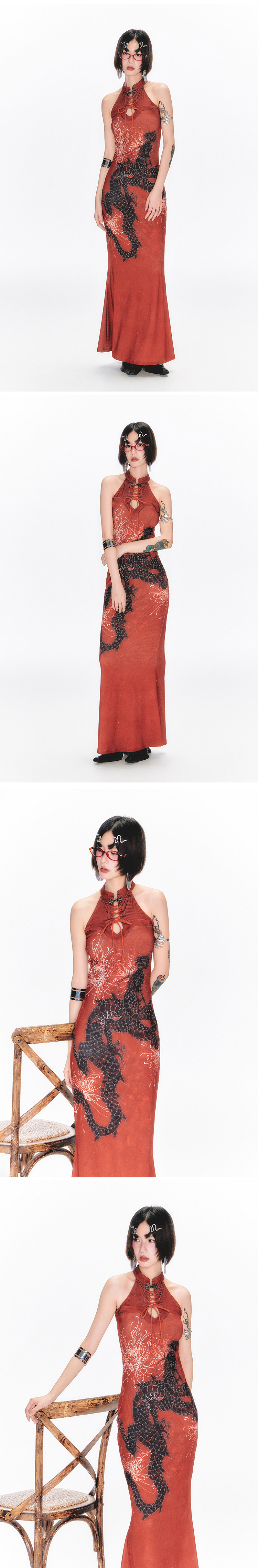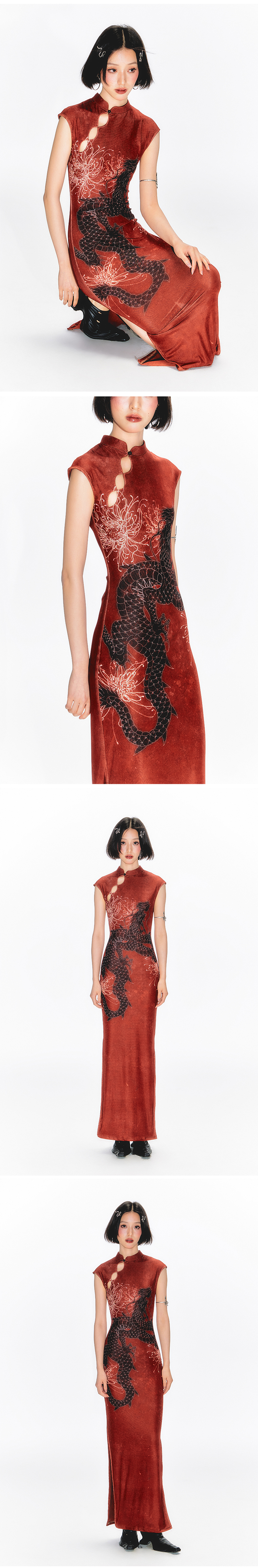 YEDM Dragon Print Stand-up Collar Sleeveless Dress