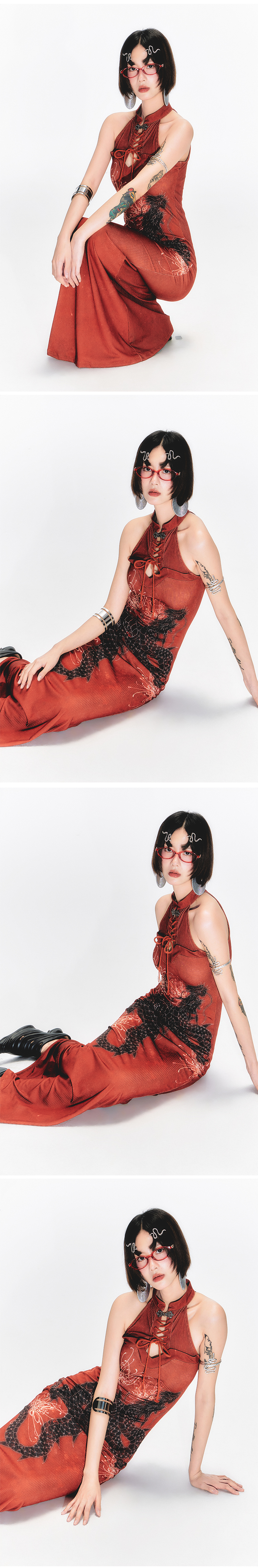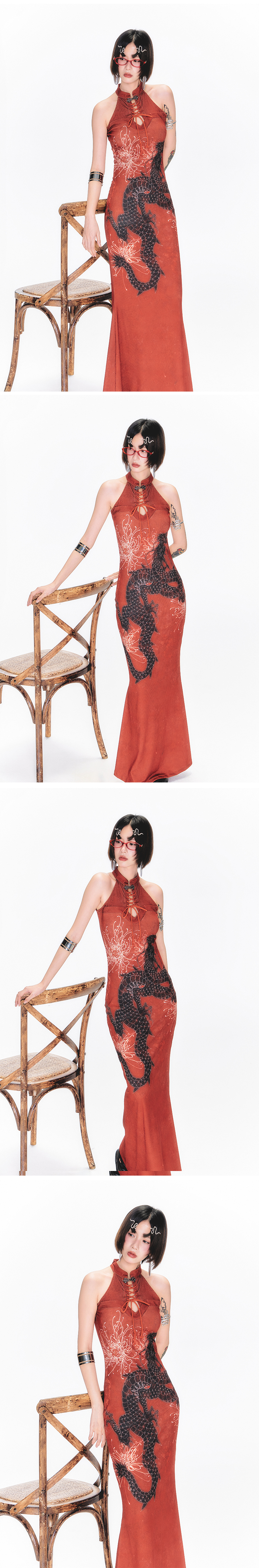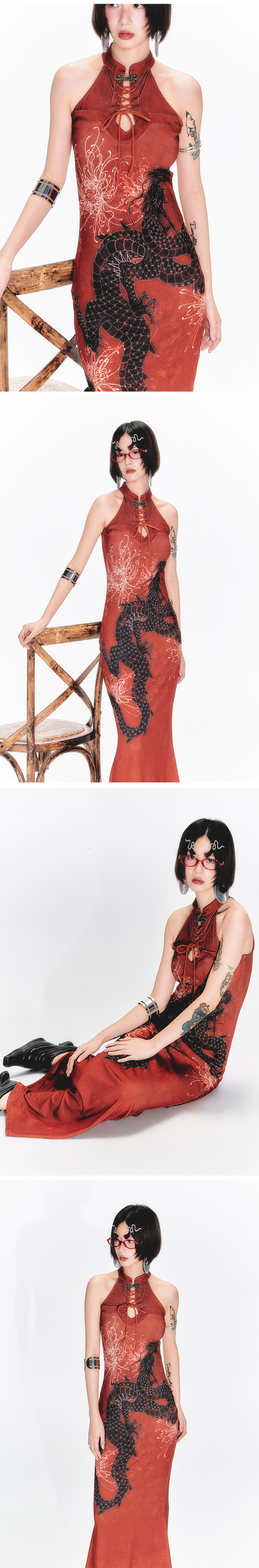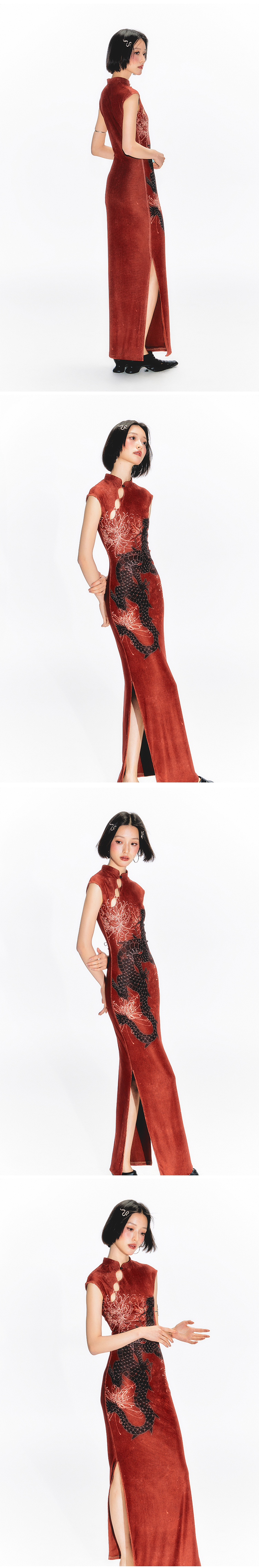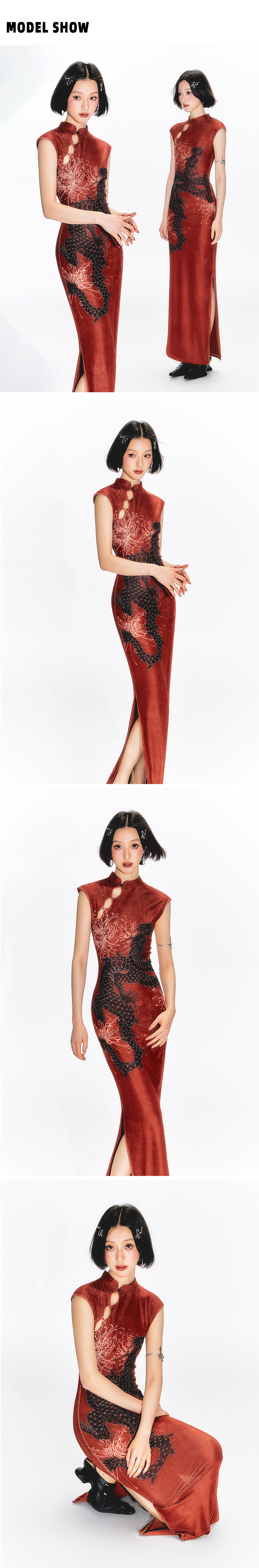 YEDM Dragon Print Stand-up Collar Sleeveless Dress