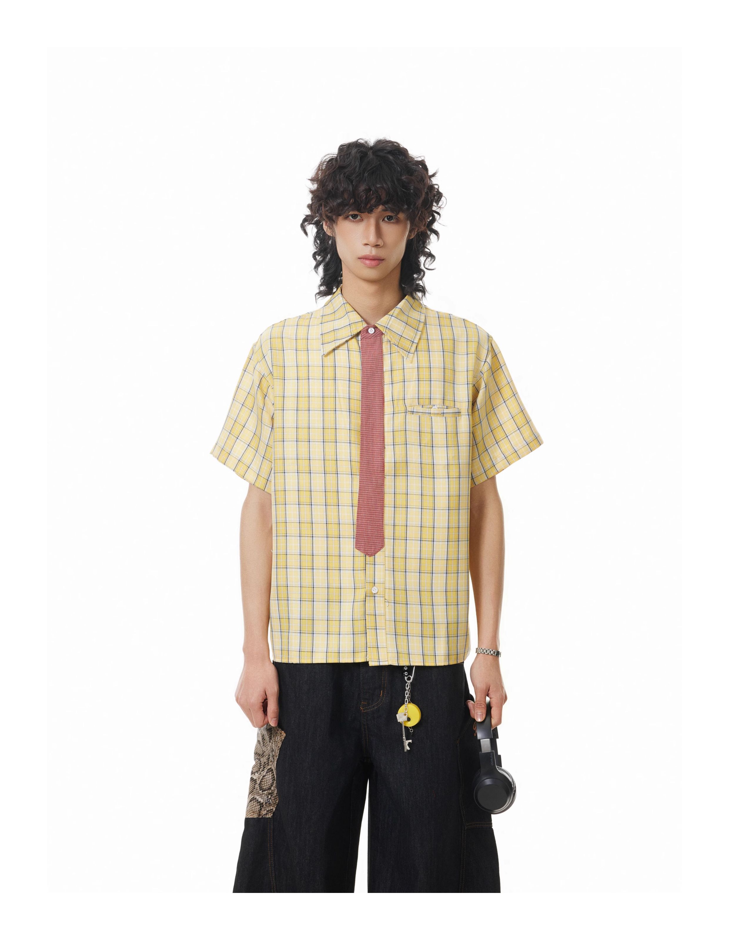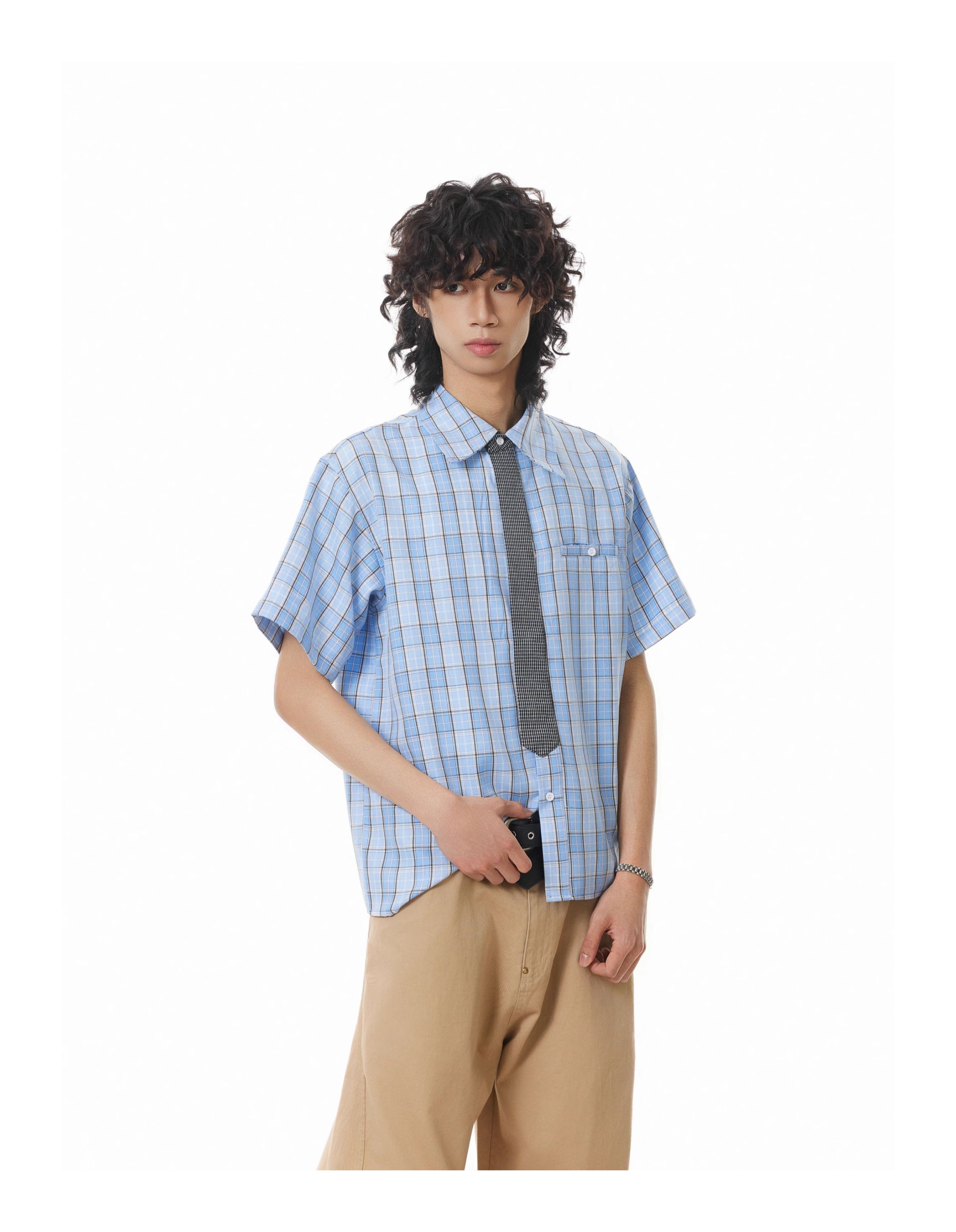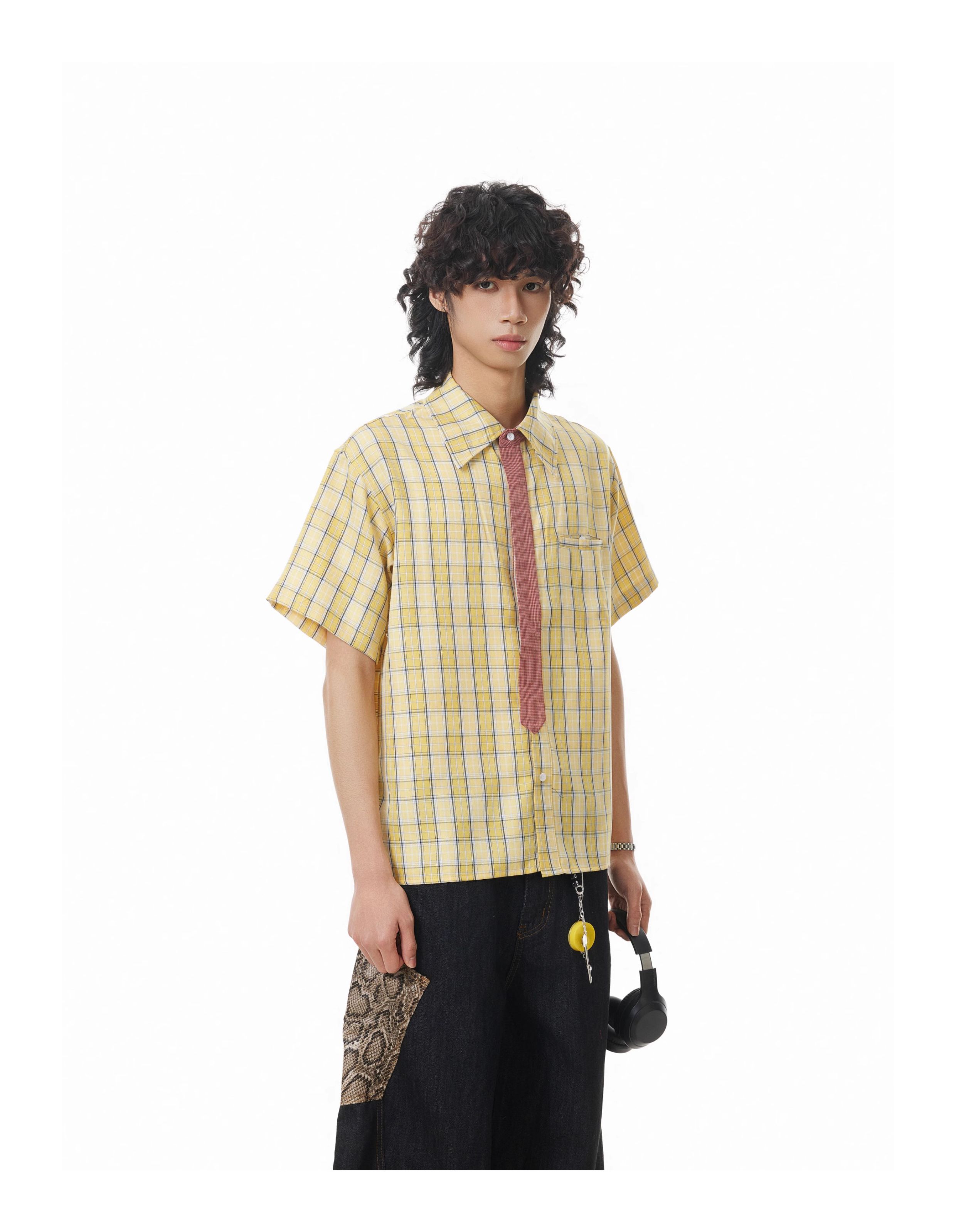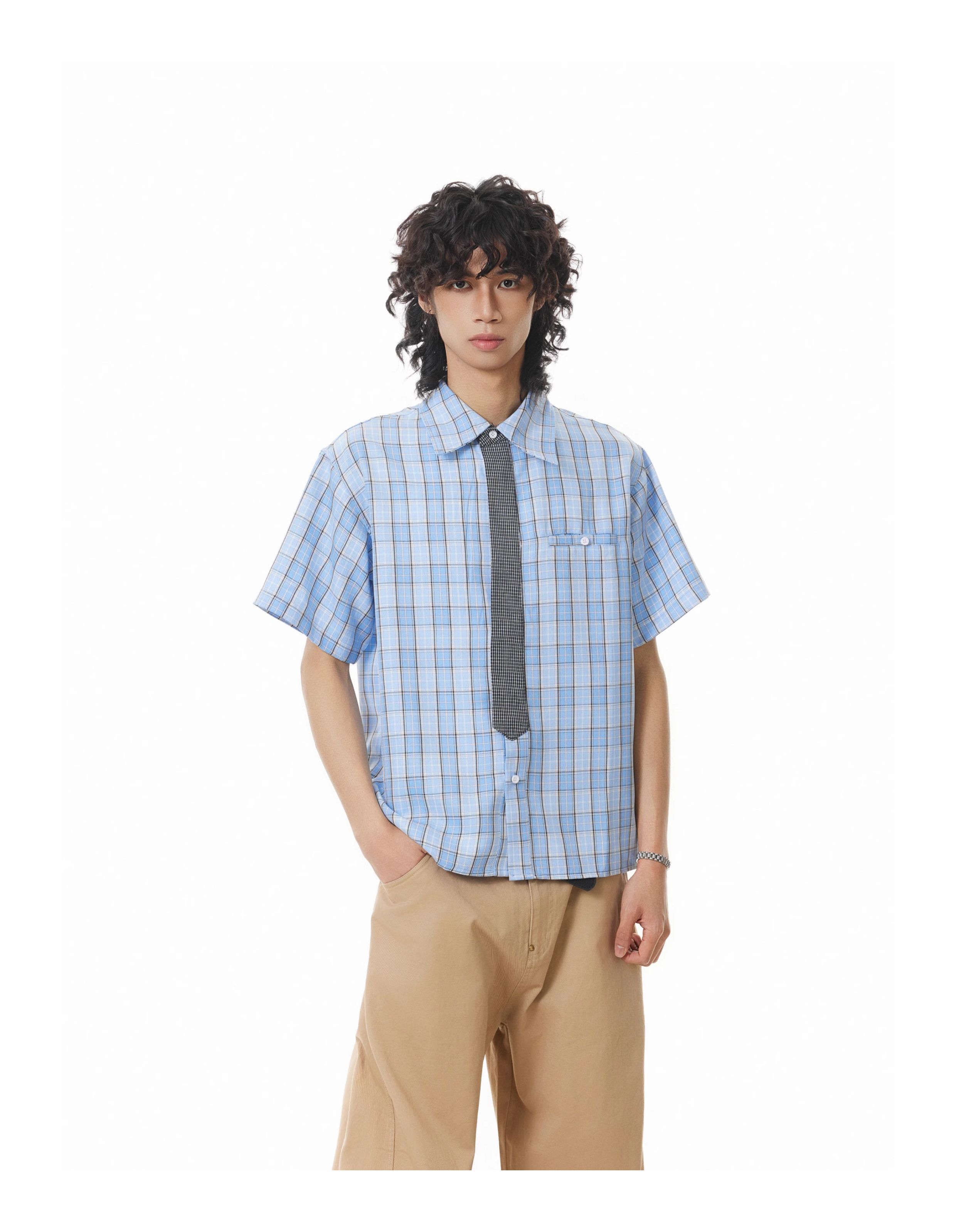 BTSG Detachable Tie Plaid Short Sleeve Shirt