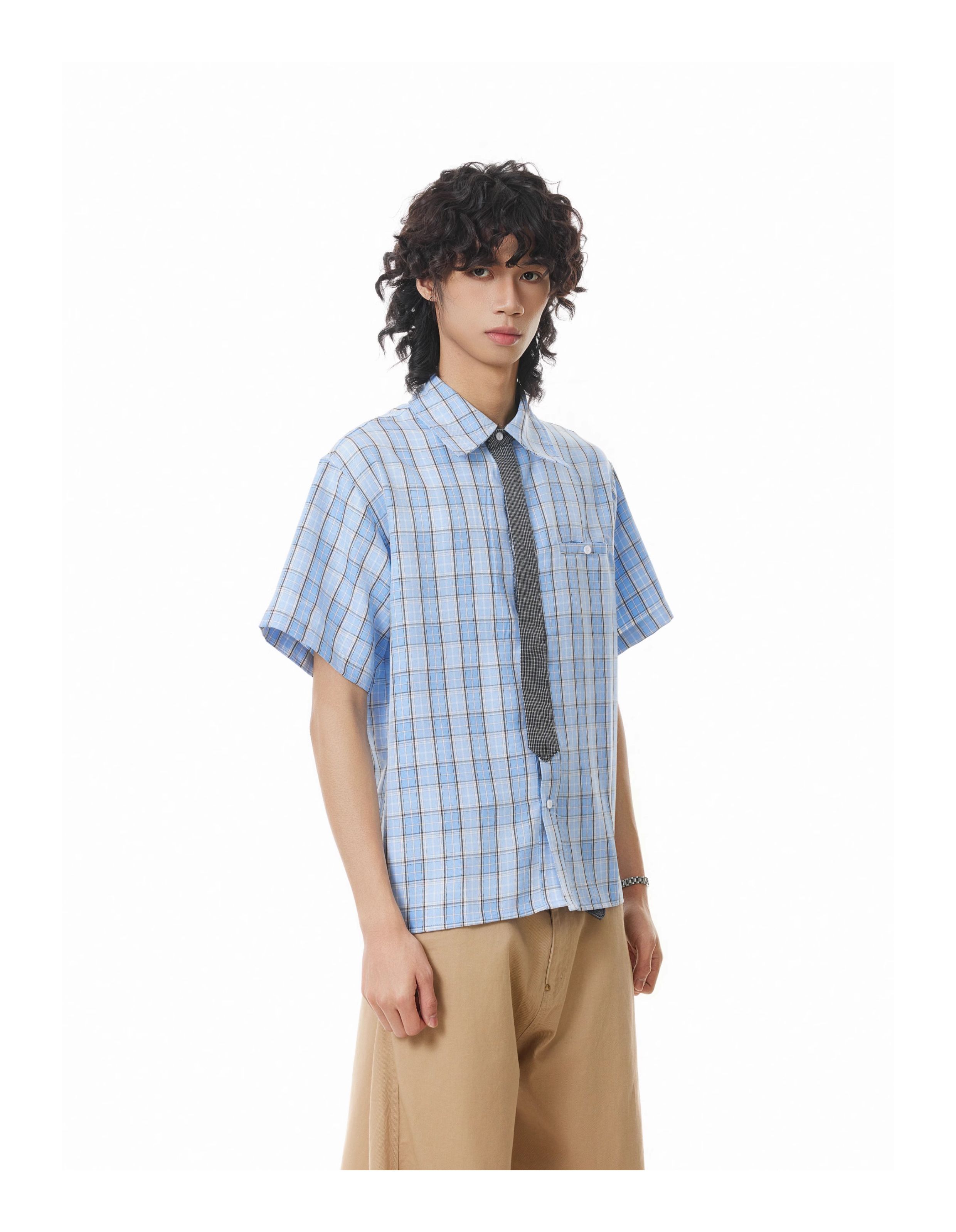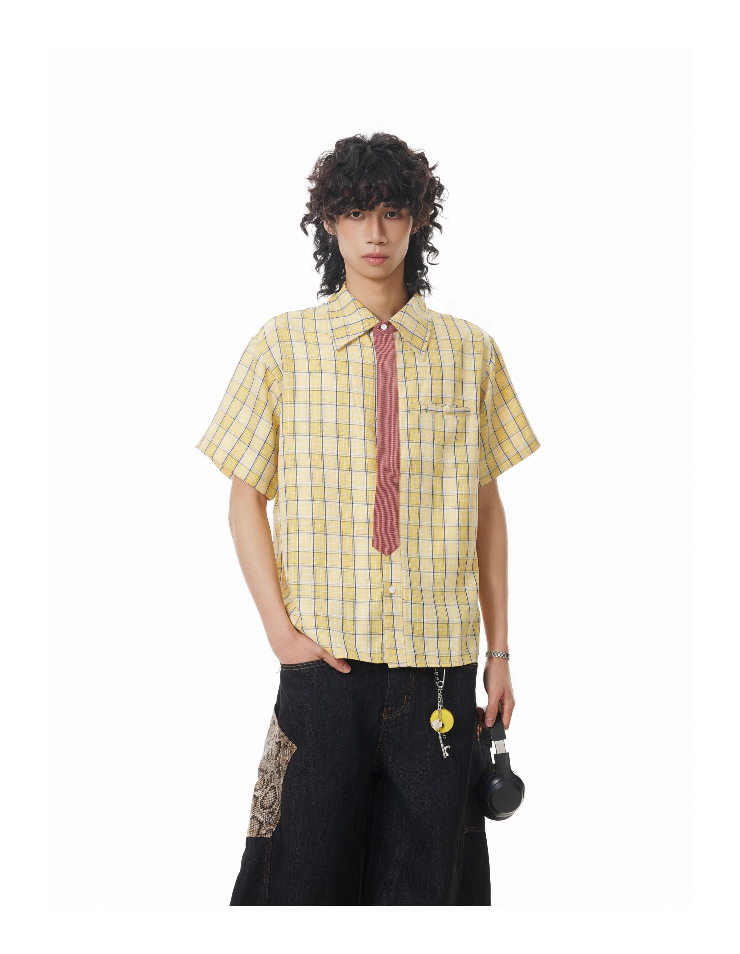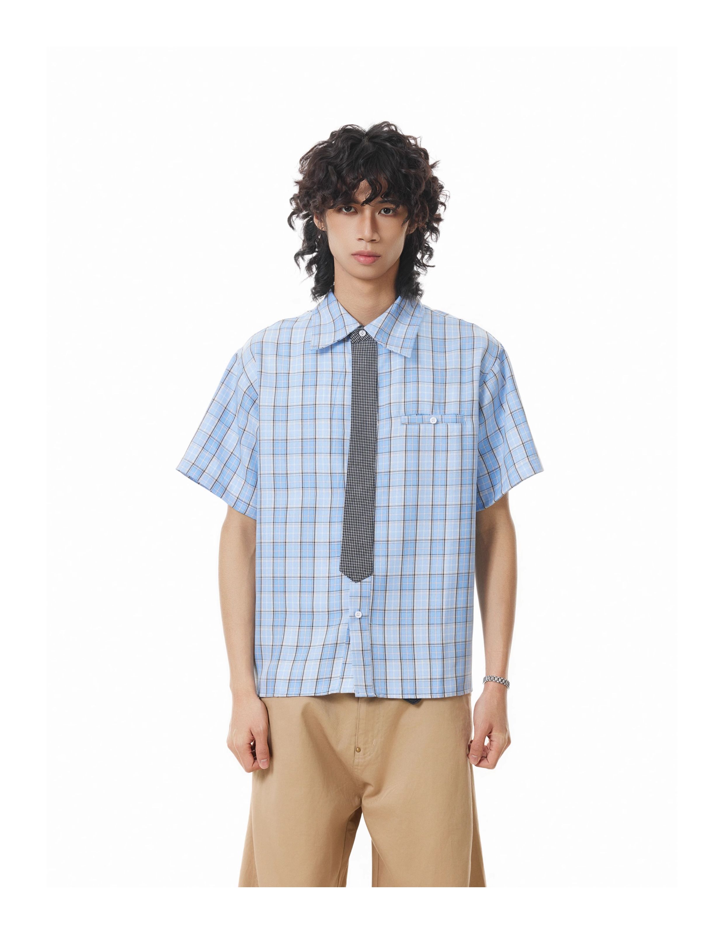 BTSG Detachable Tie Plaid Short Sleeve Shirt
