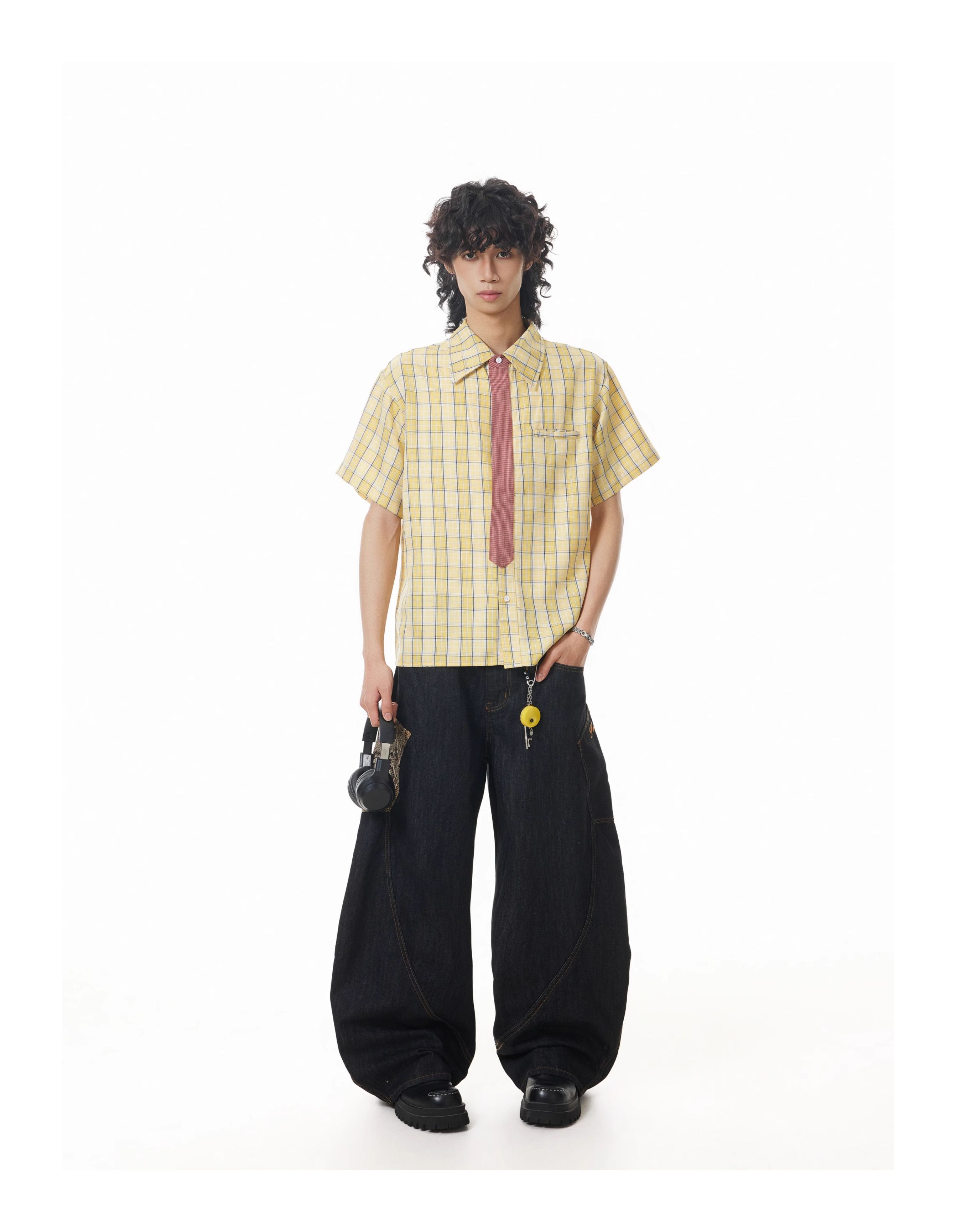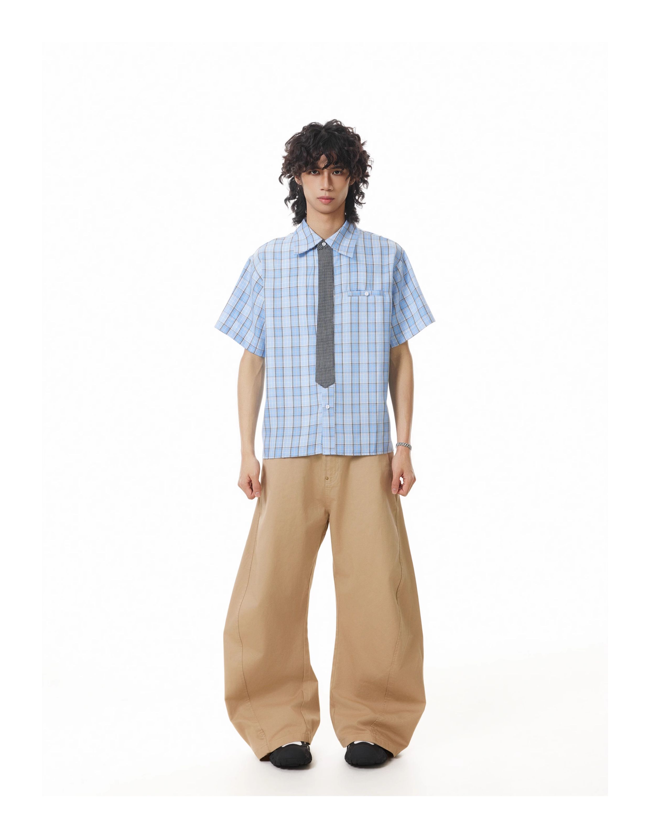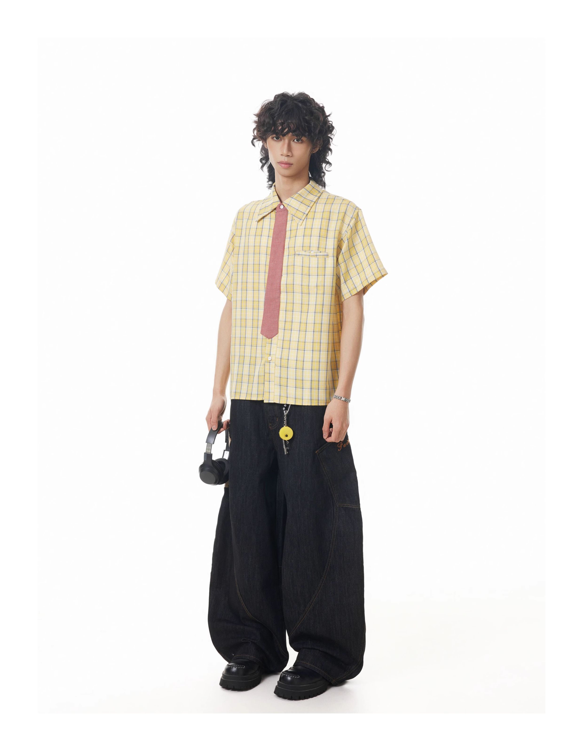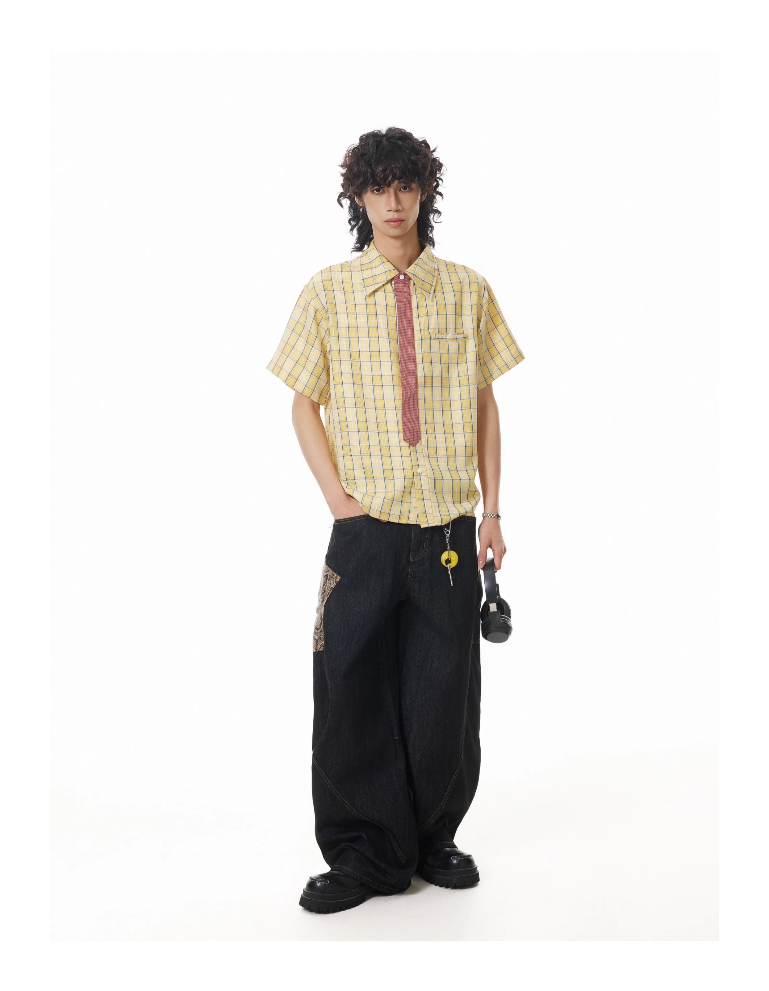 BTSG Detachable Tie Plaid Short Sleeve Shirt