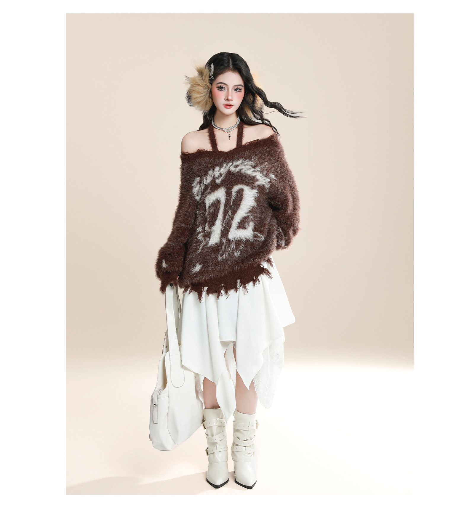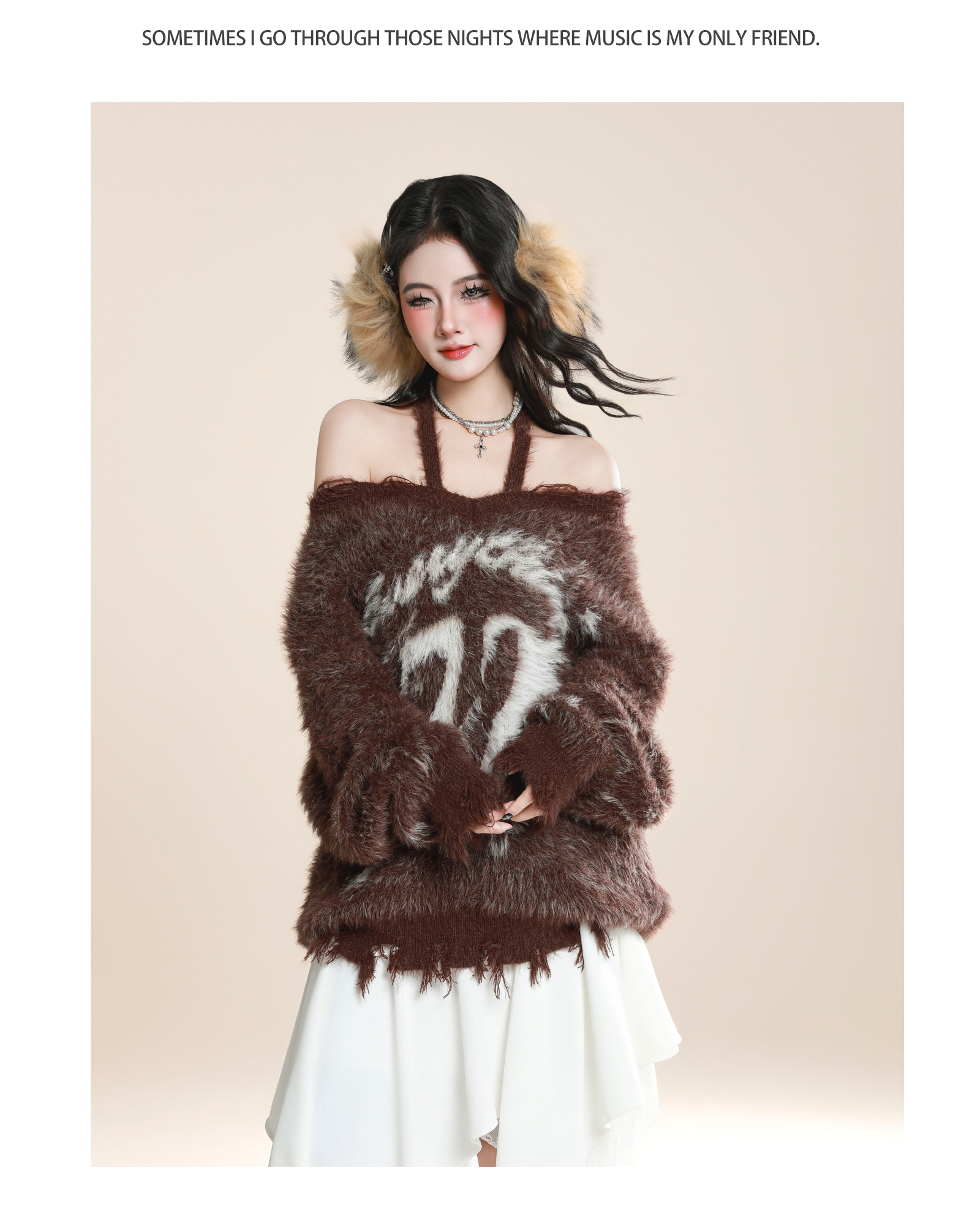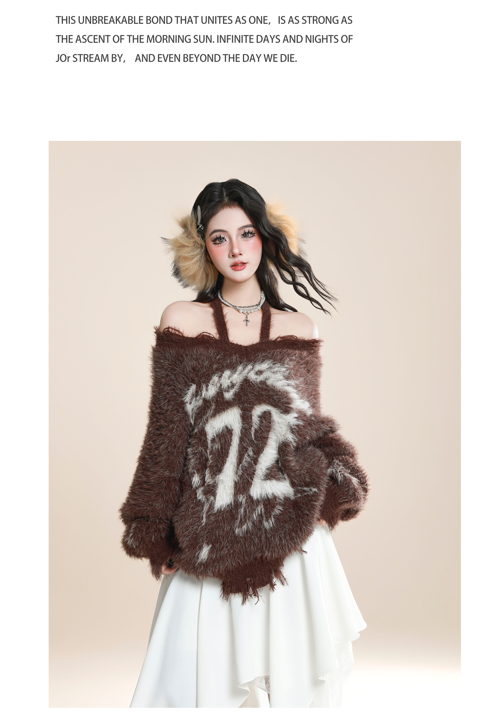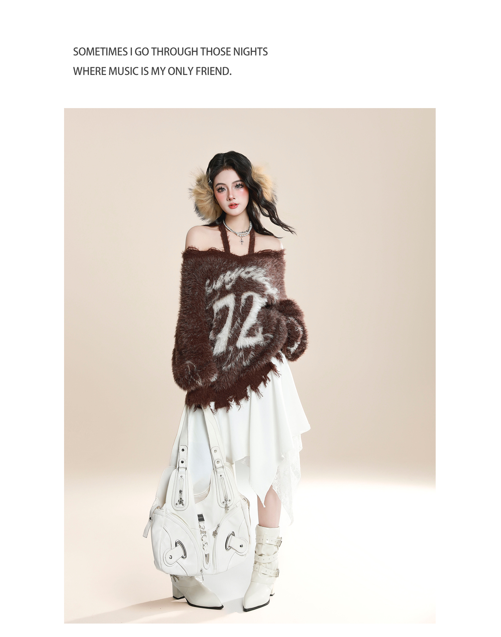 HTYM Halter One-Shoulder Mohair Sweater for Women