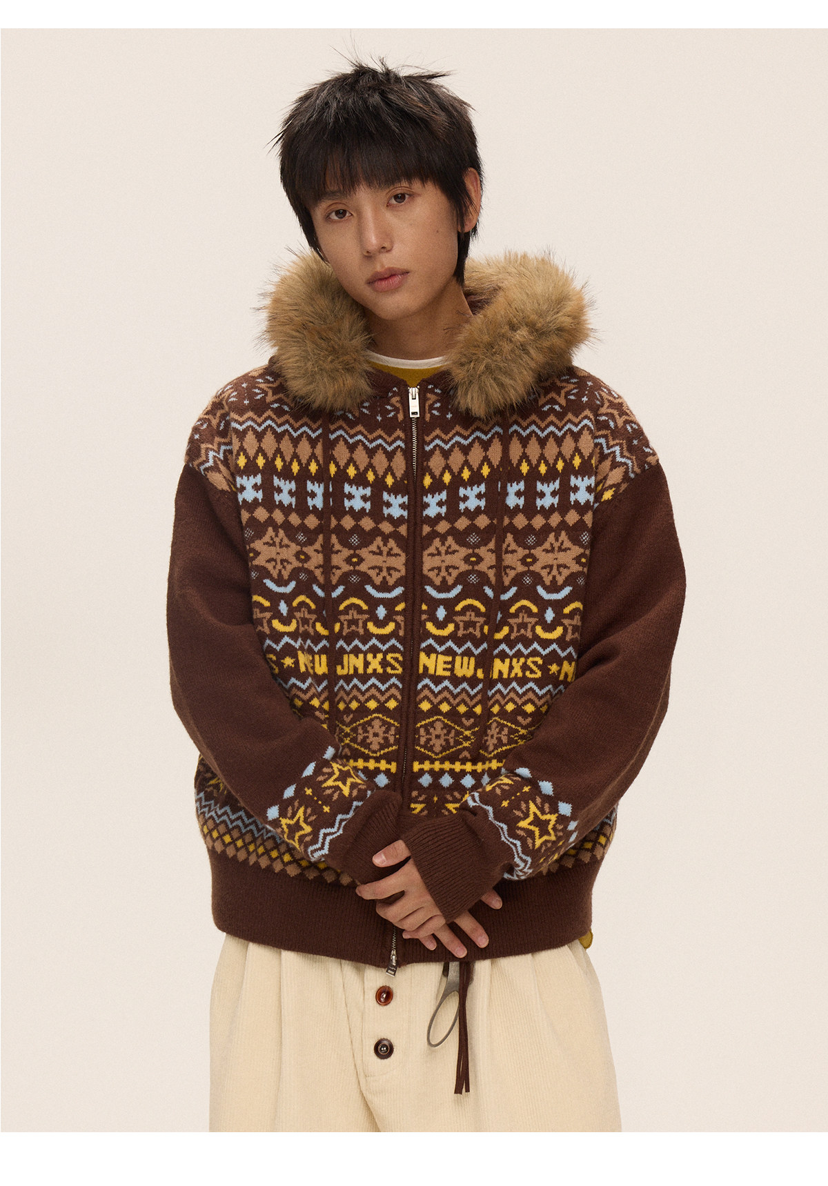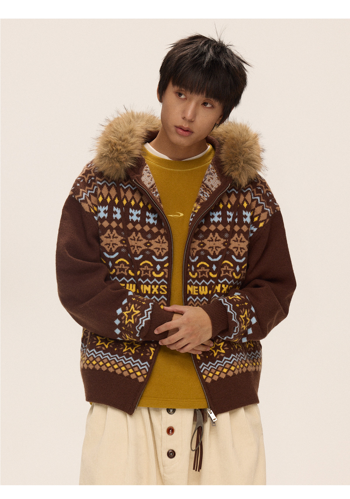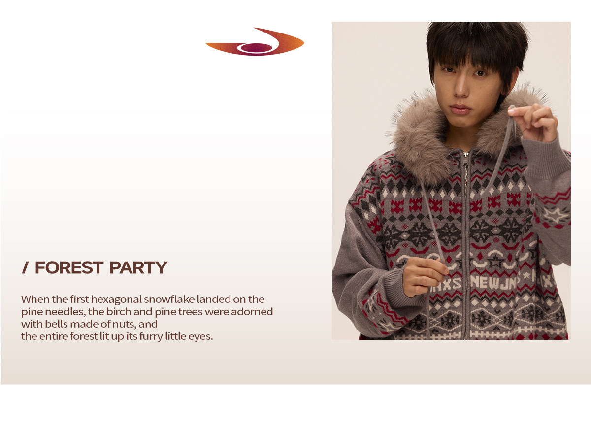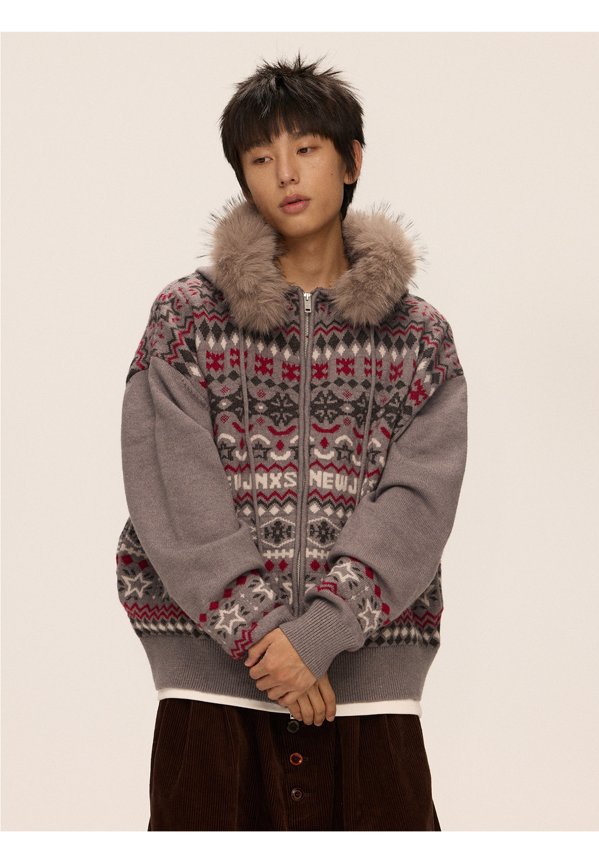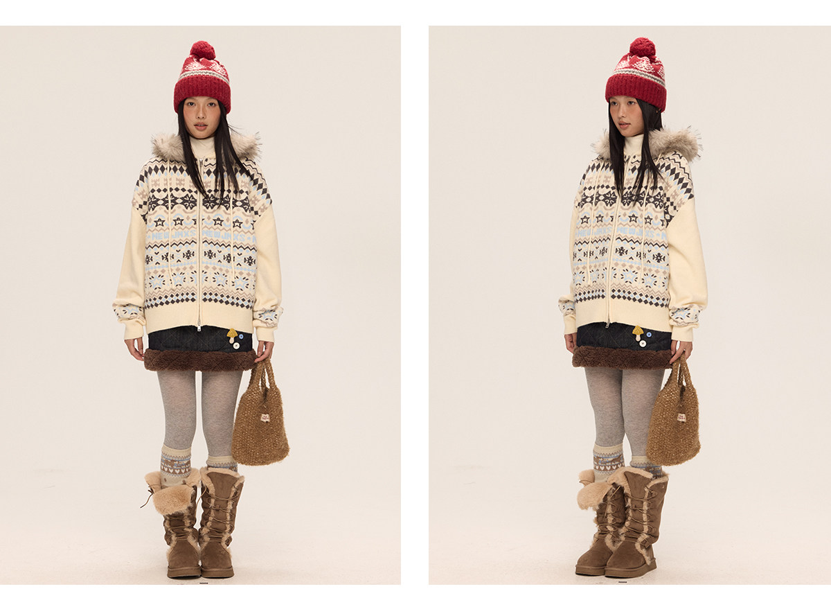 Mr. Jiangnan & andall Fair Isle Detachable Fur Collar Knit Cardigan