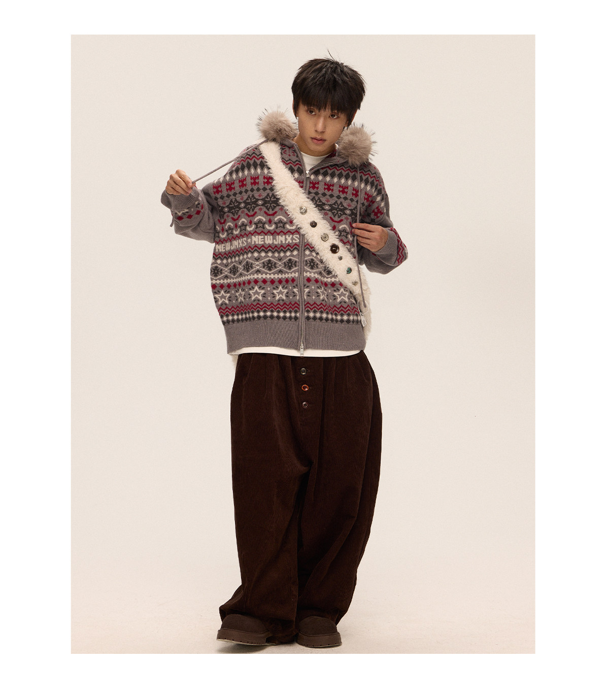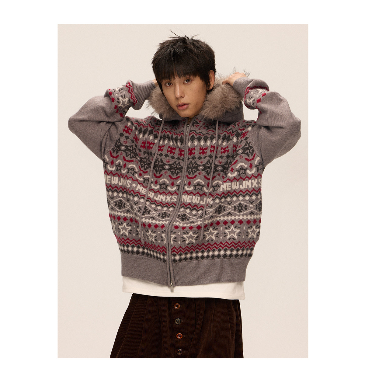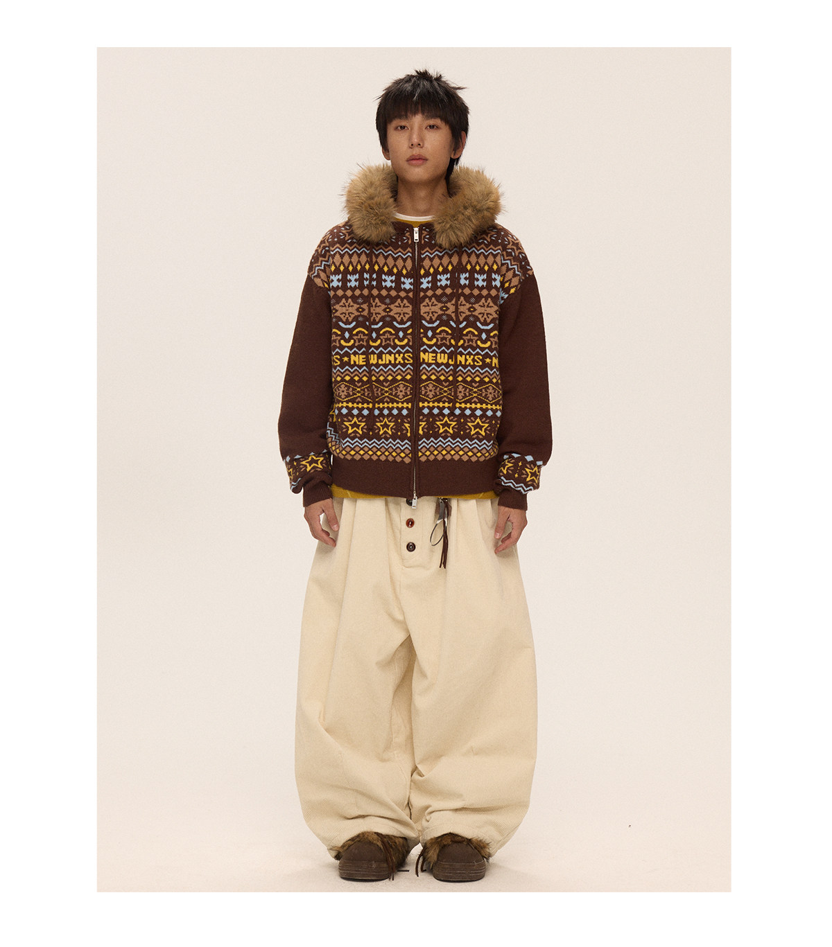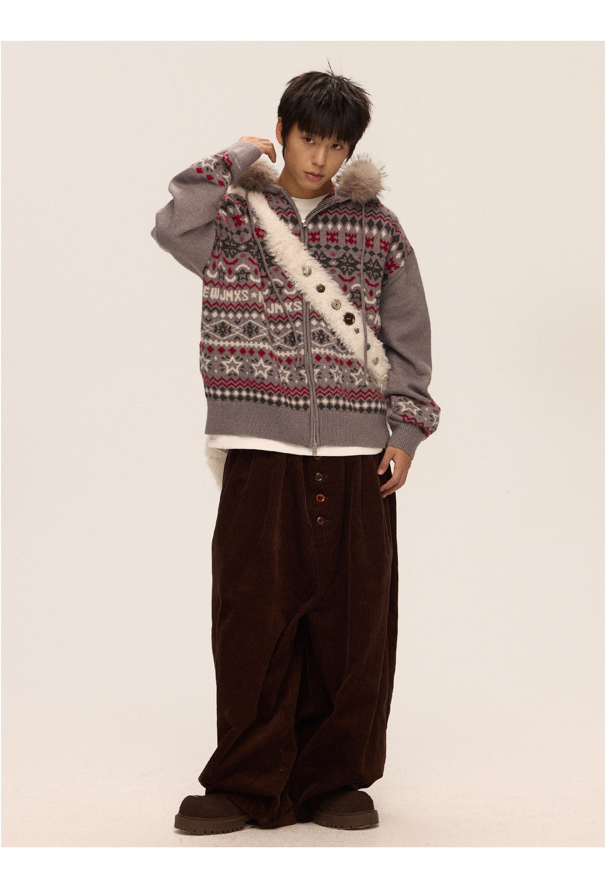 Mr. Jiangnan & andall Fair Isle Detachable Fur Collar Knit Cardigan