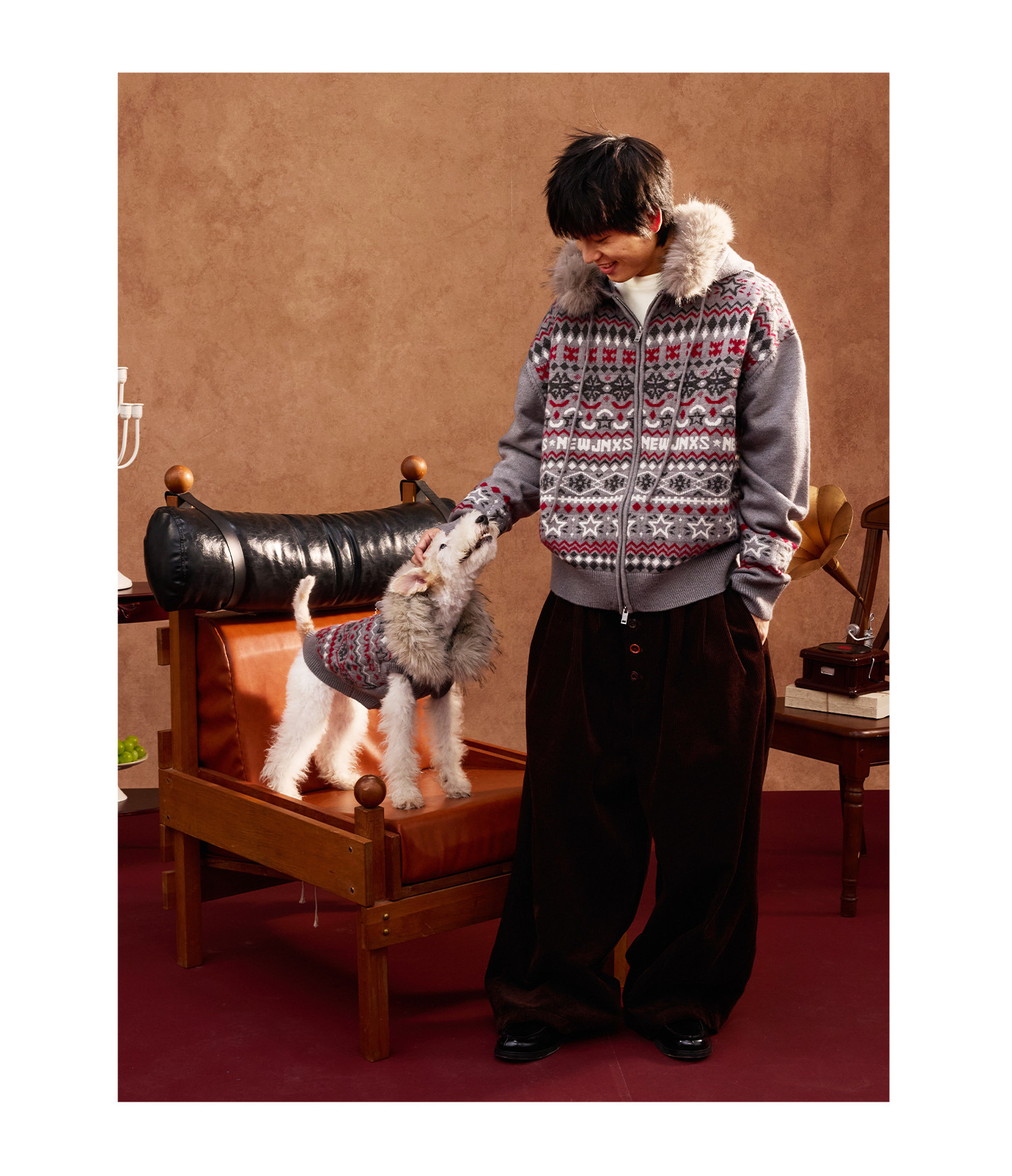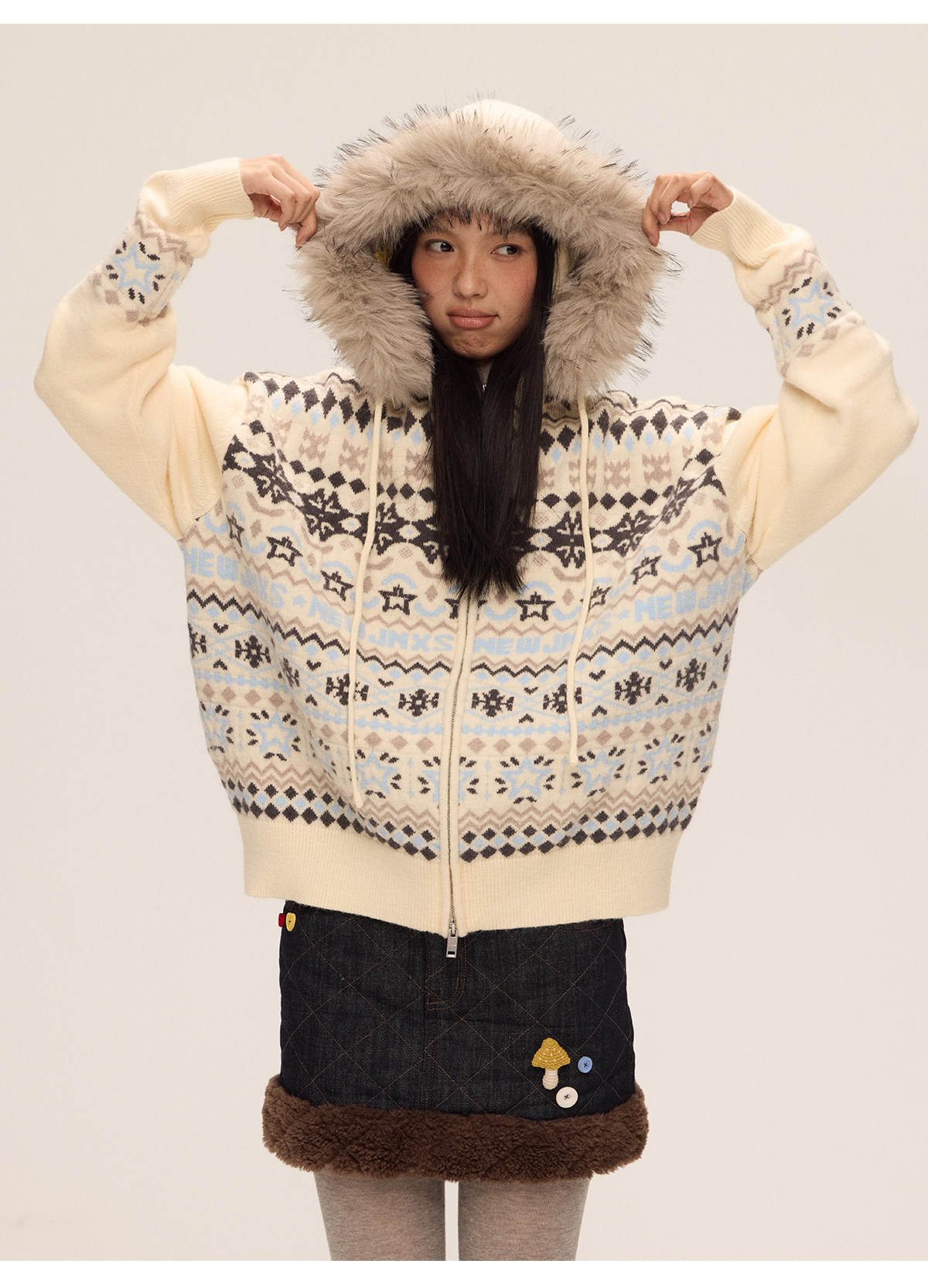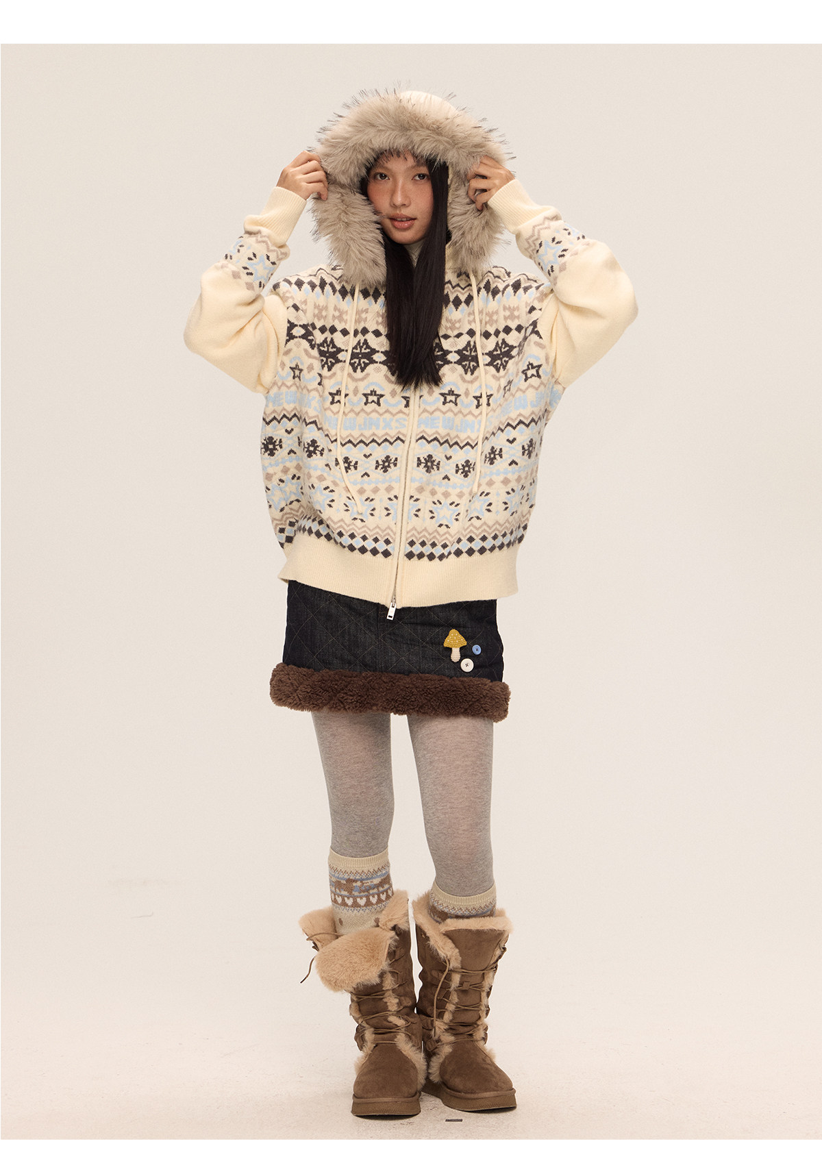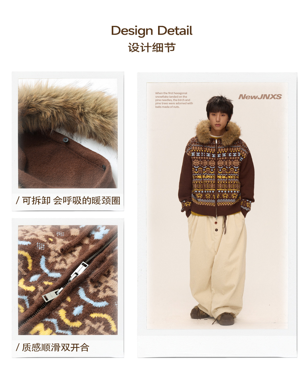 Mr. Jiangnan & andall Fair Isle Detachable Fur Collar Knit Cardigan