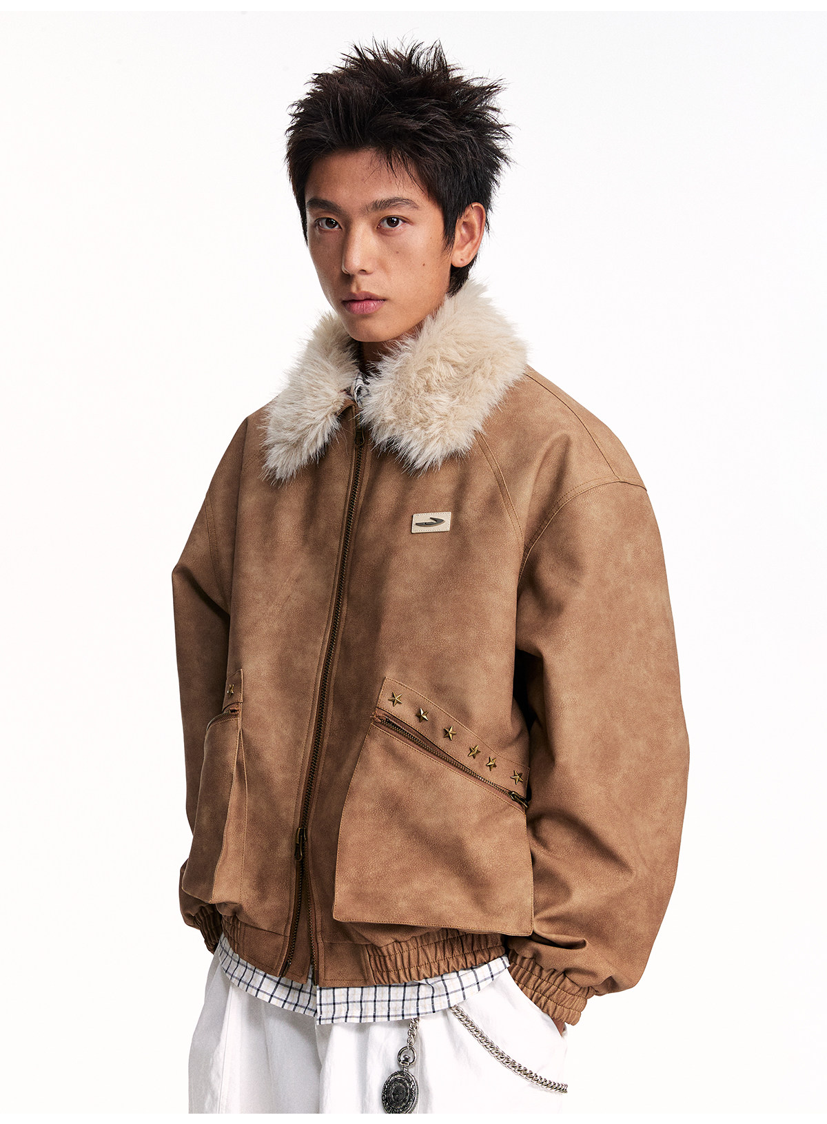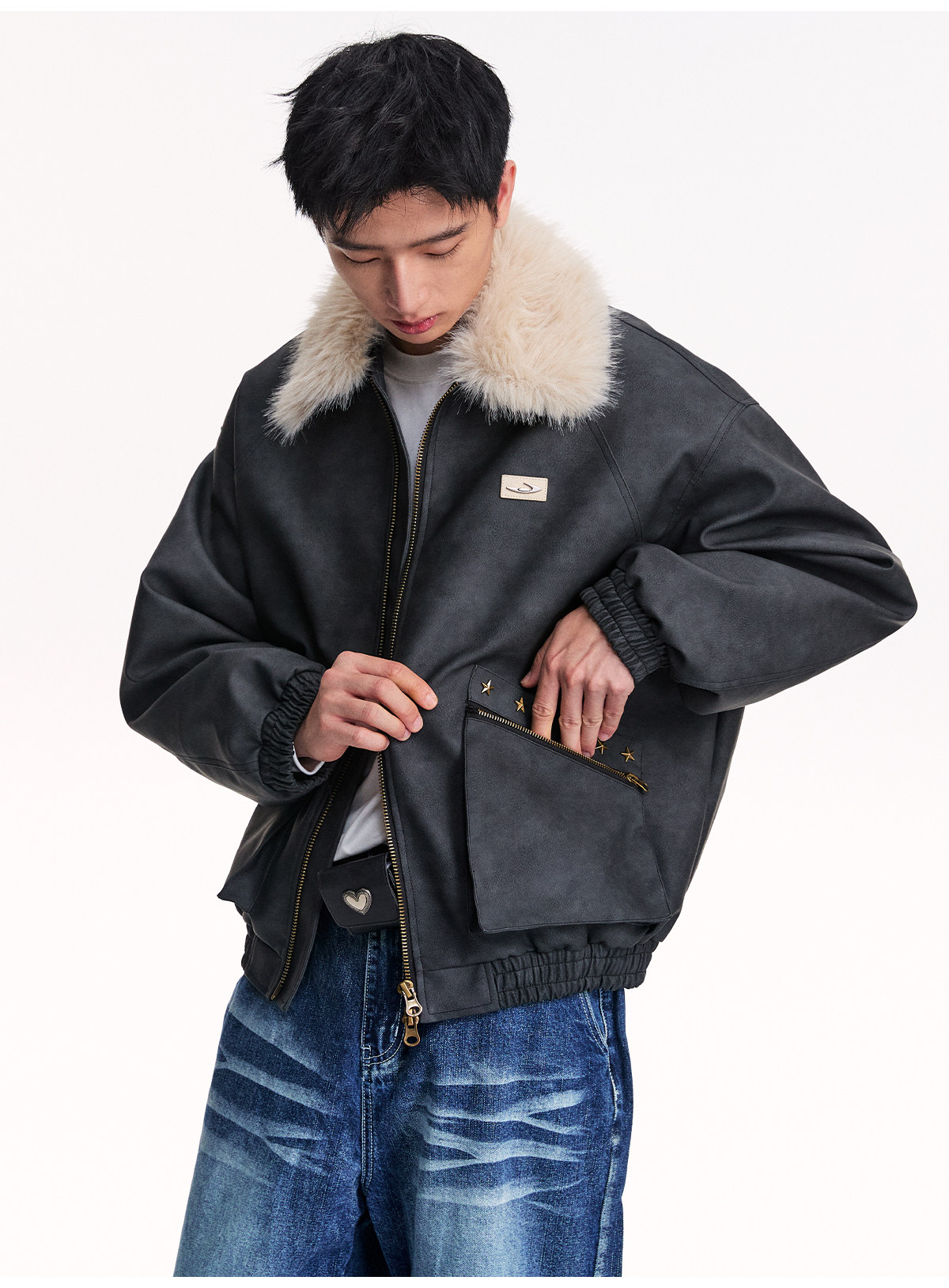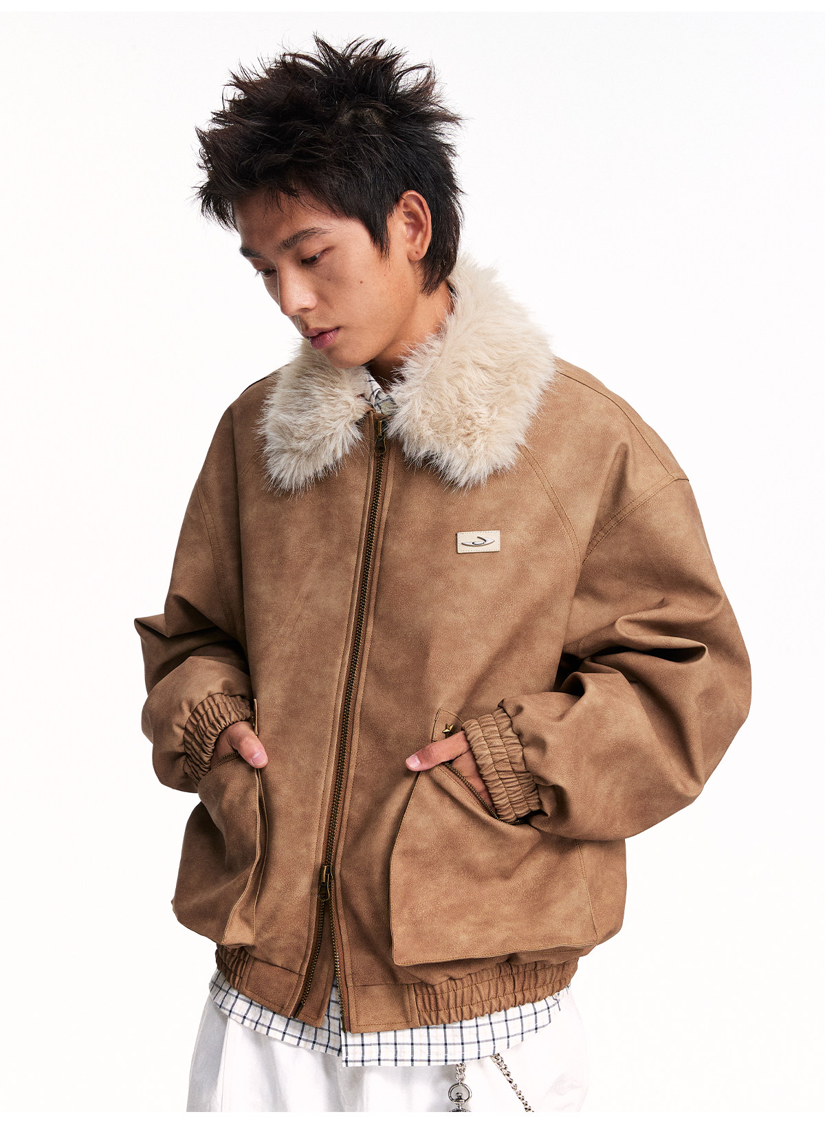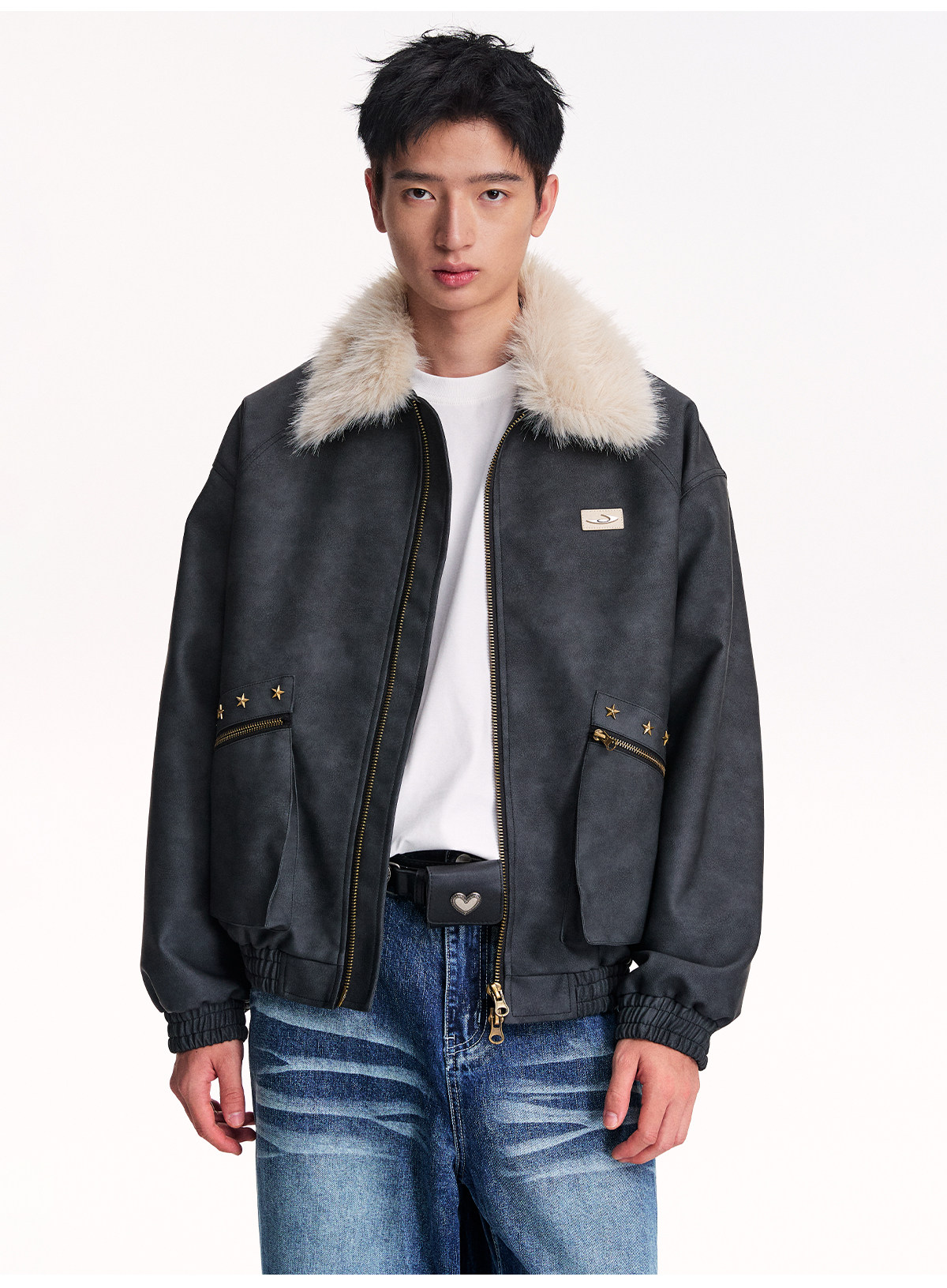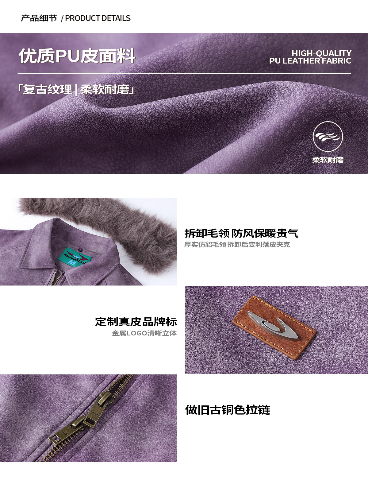 Mr. Jiangnan NewJNXS Retro PU Leather Jacket with Detachable Fur Collar