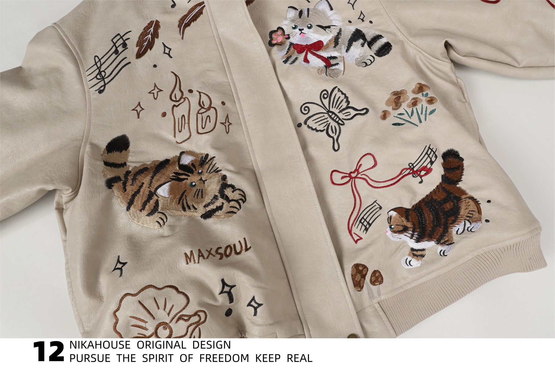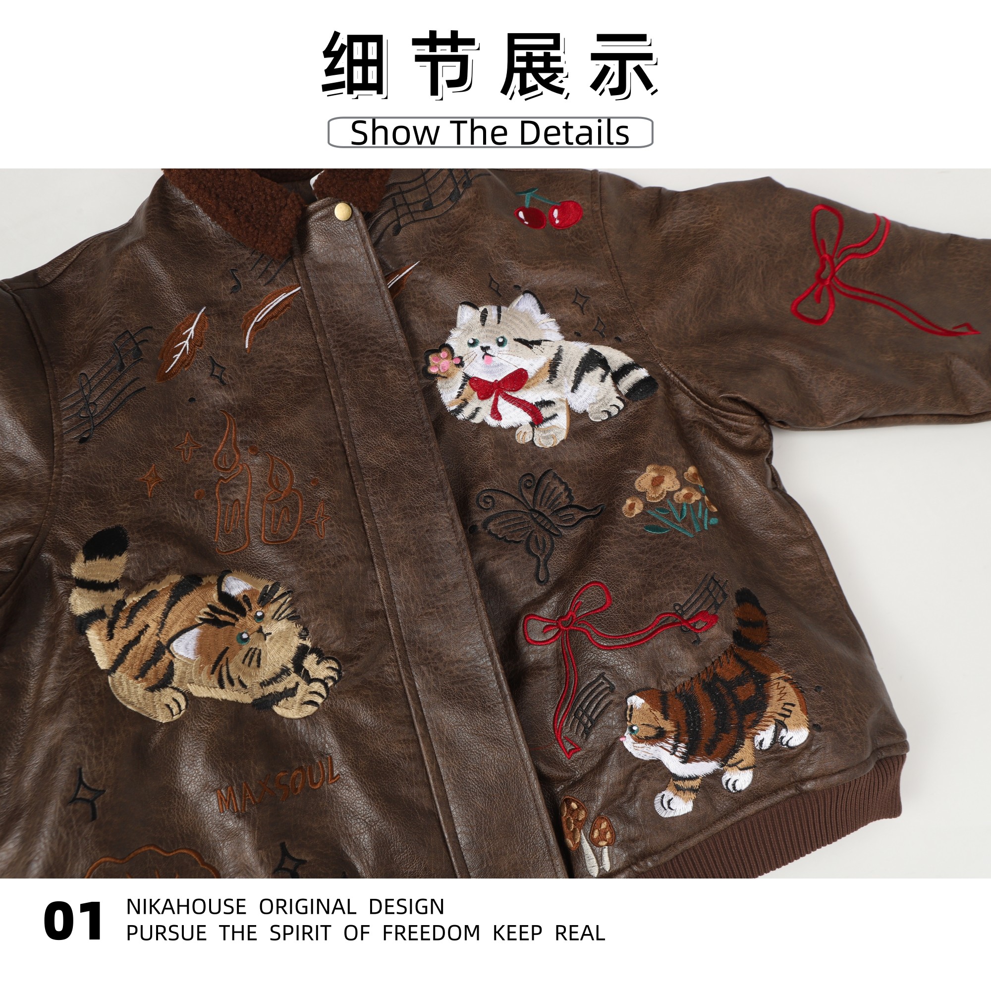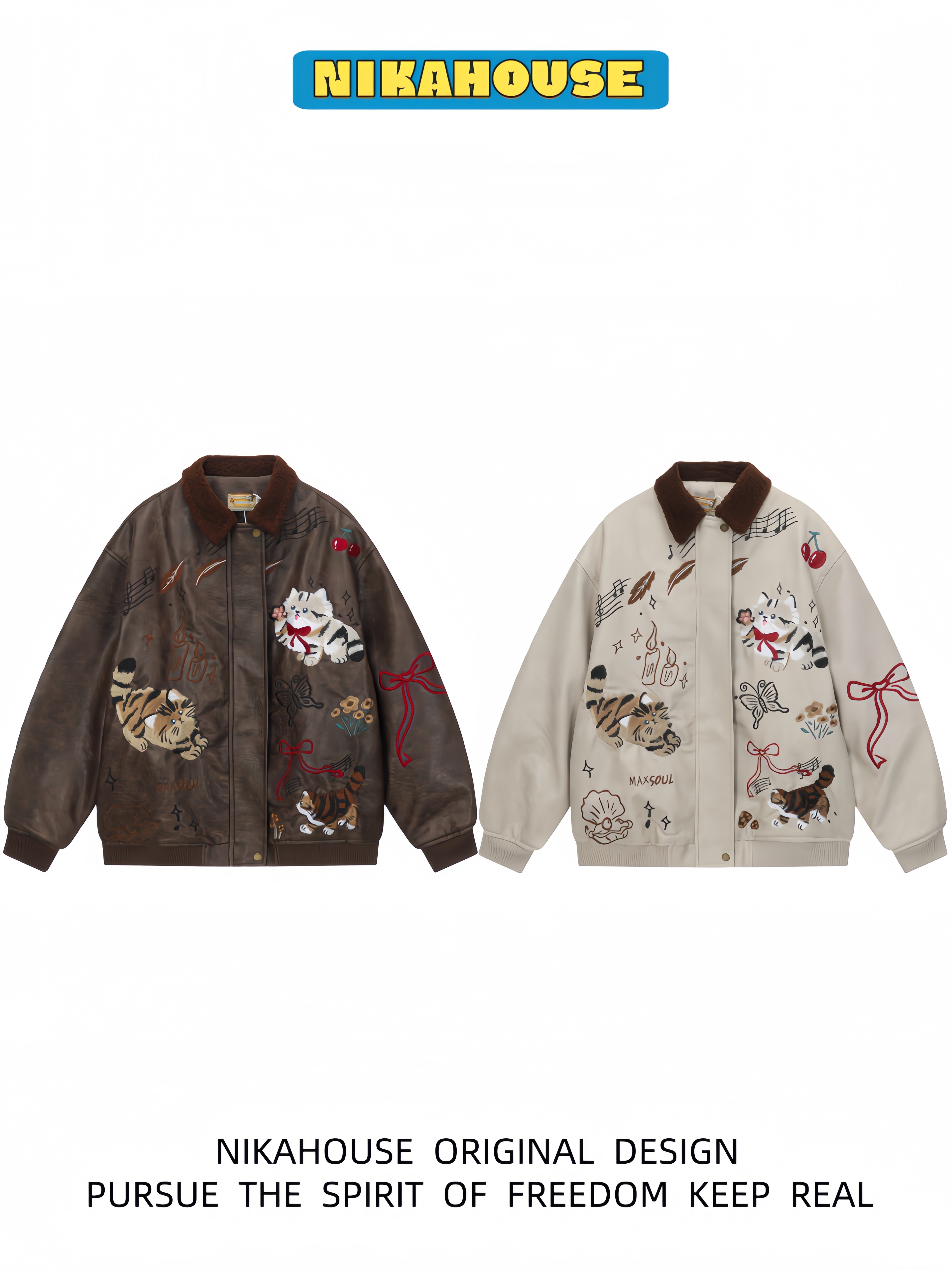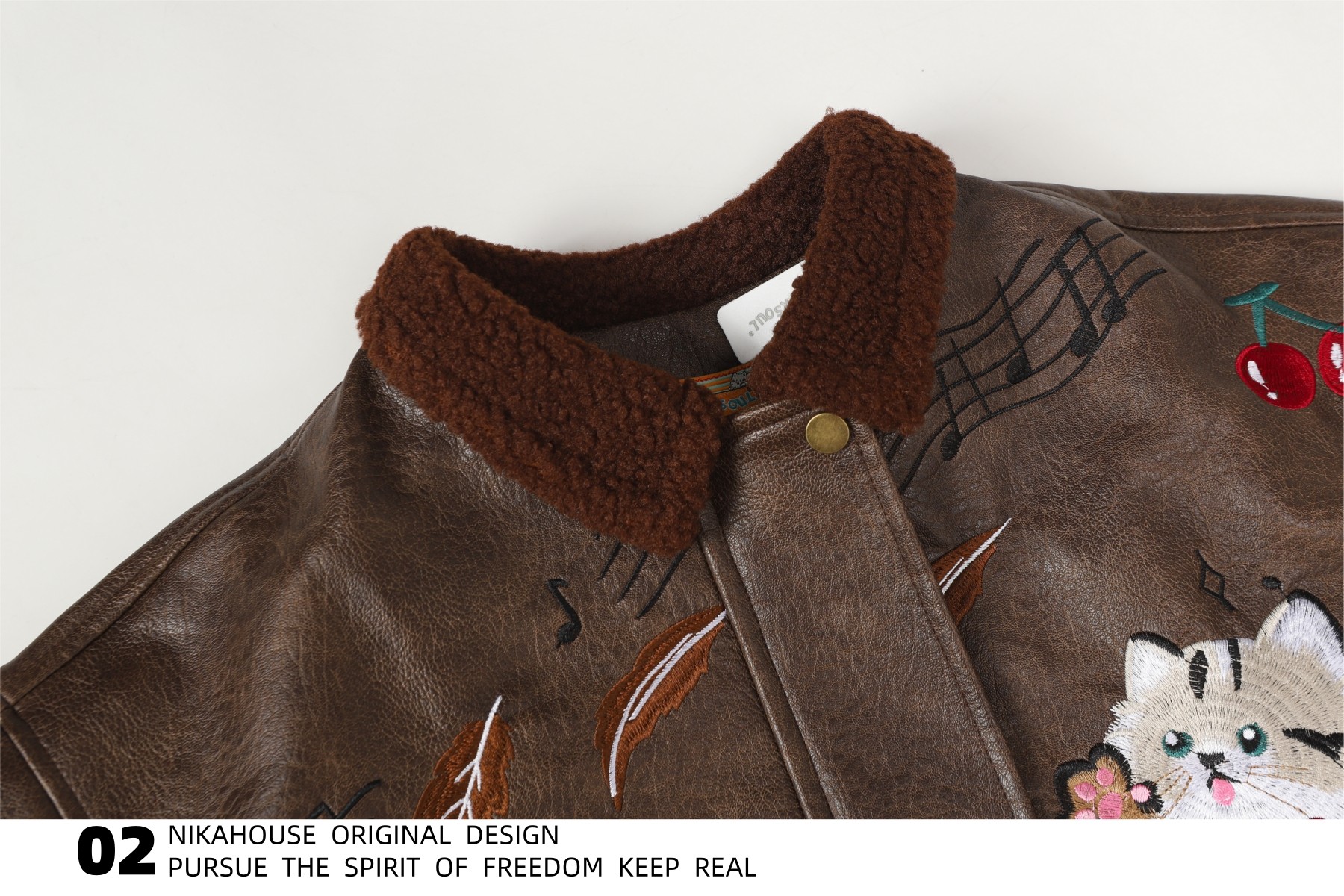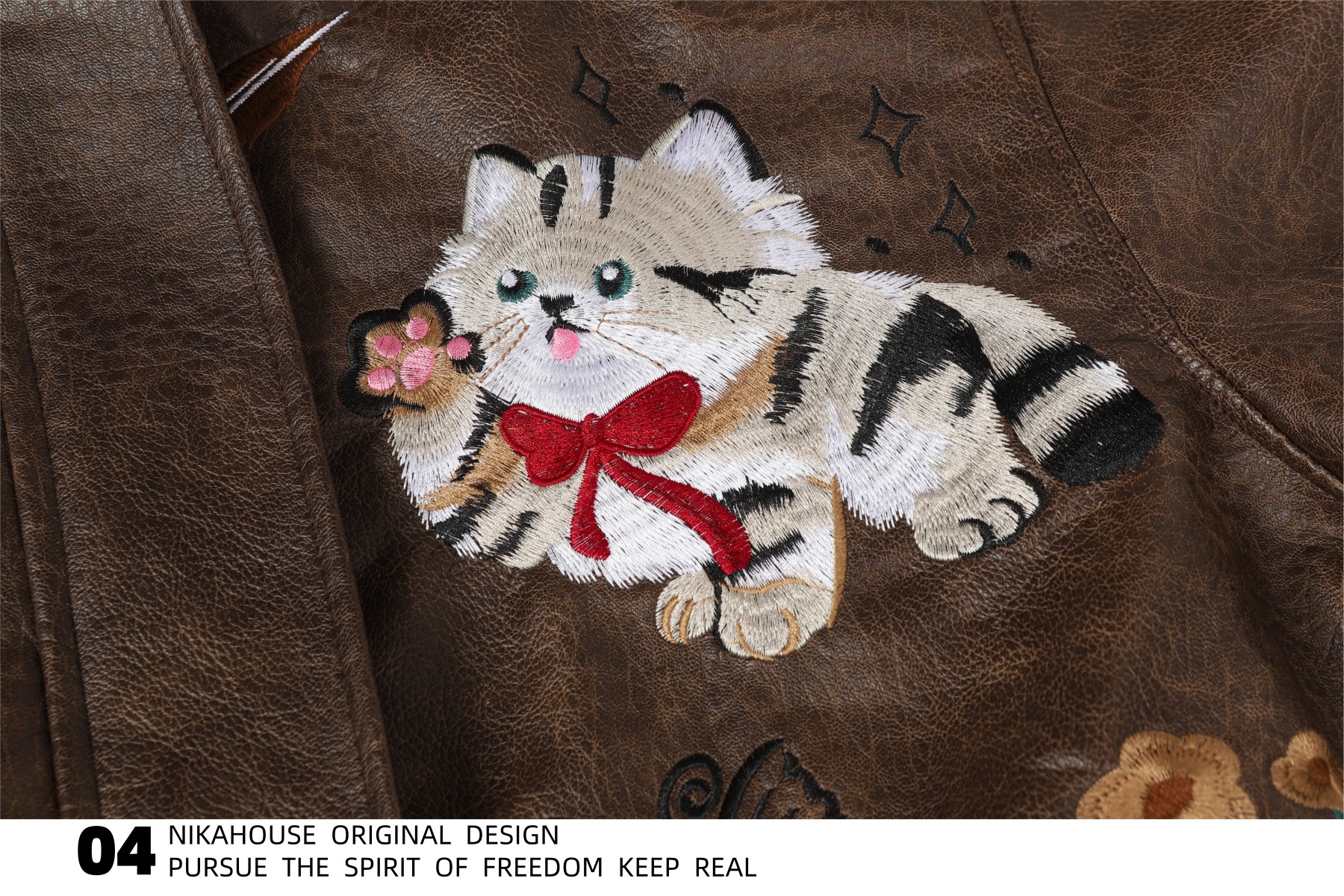 NIKAHOUSE Washed Cute Cat Embroidery Fur Leather Jacket