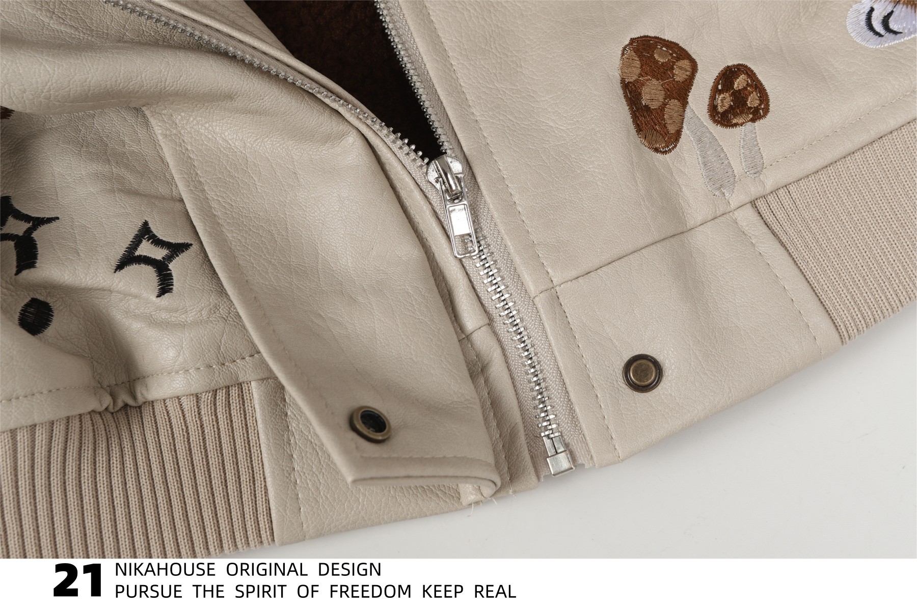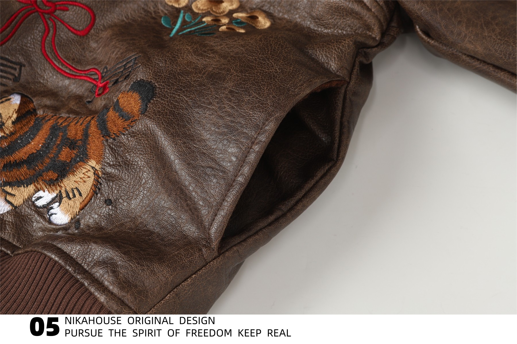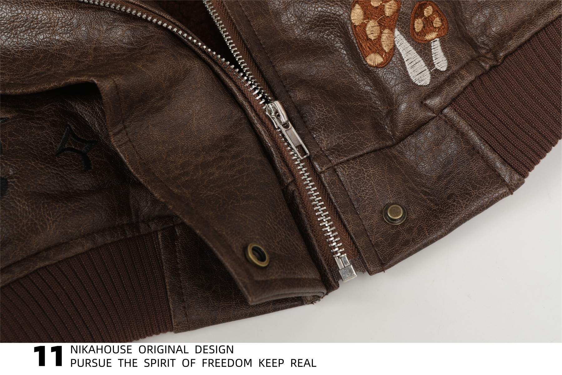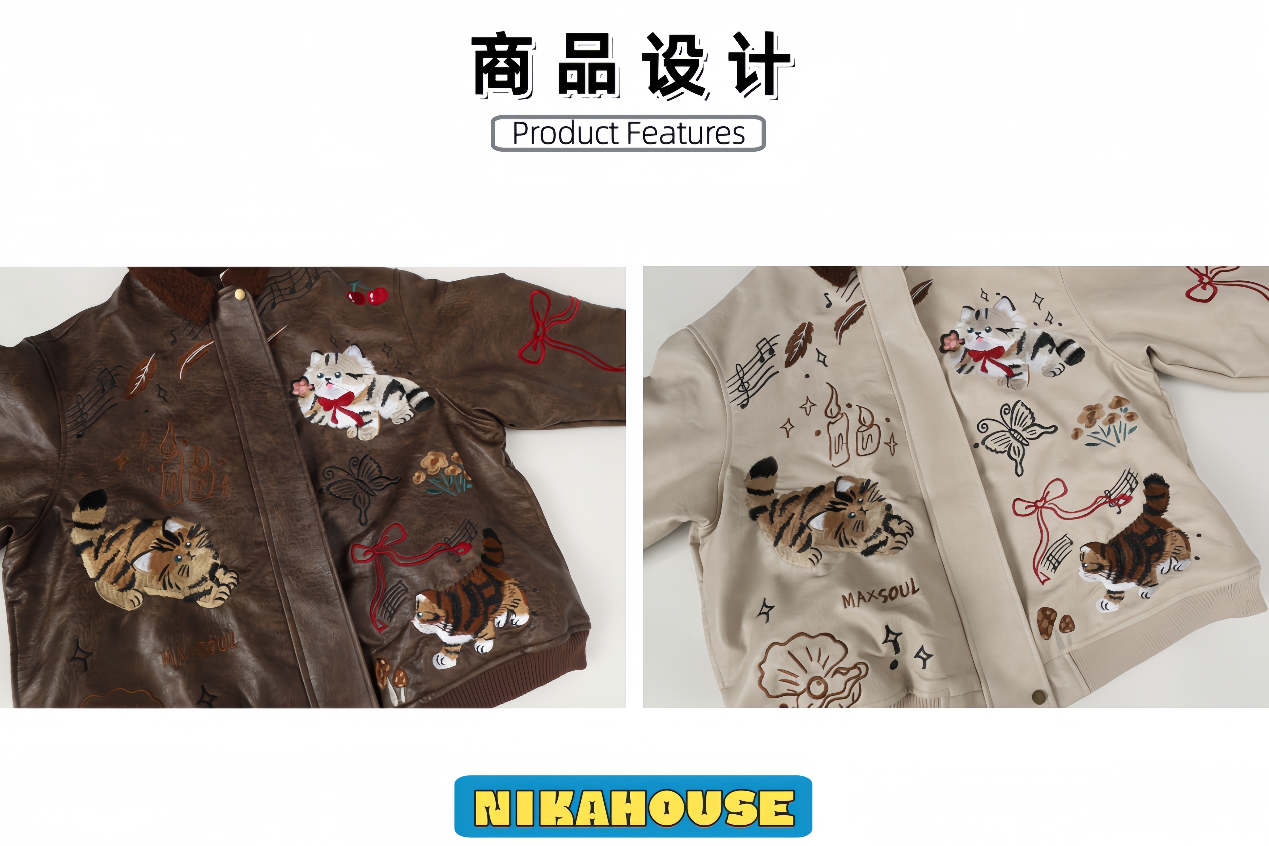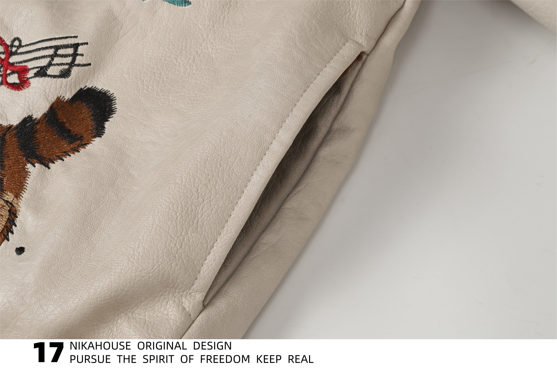 NIKAHOUSE Washed Cute Cat Embroidery Fur Leather Jacket